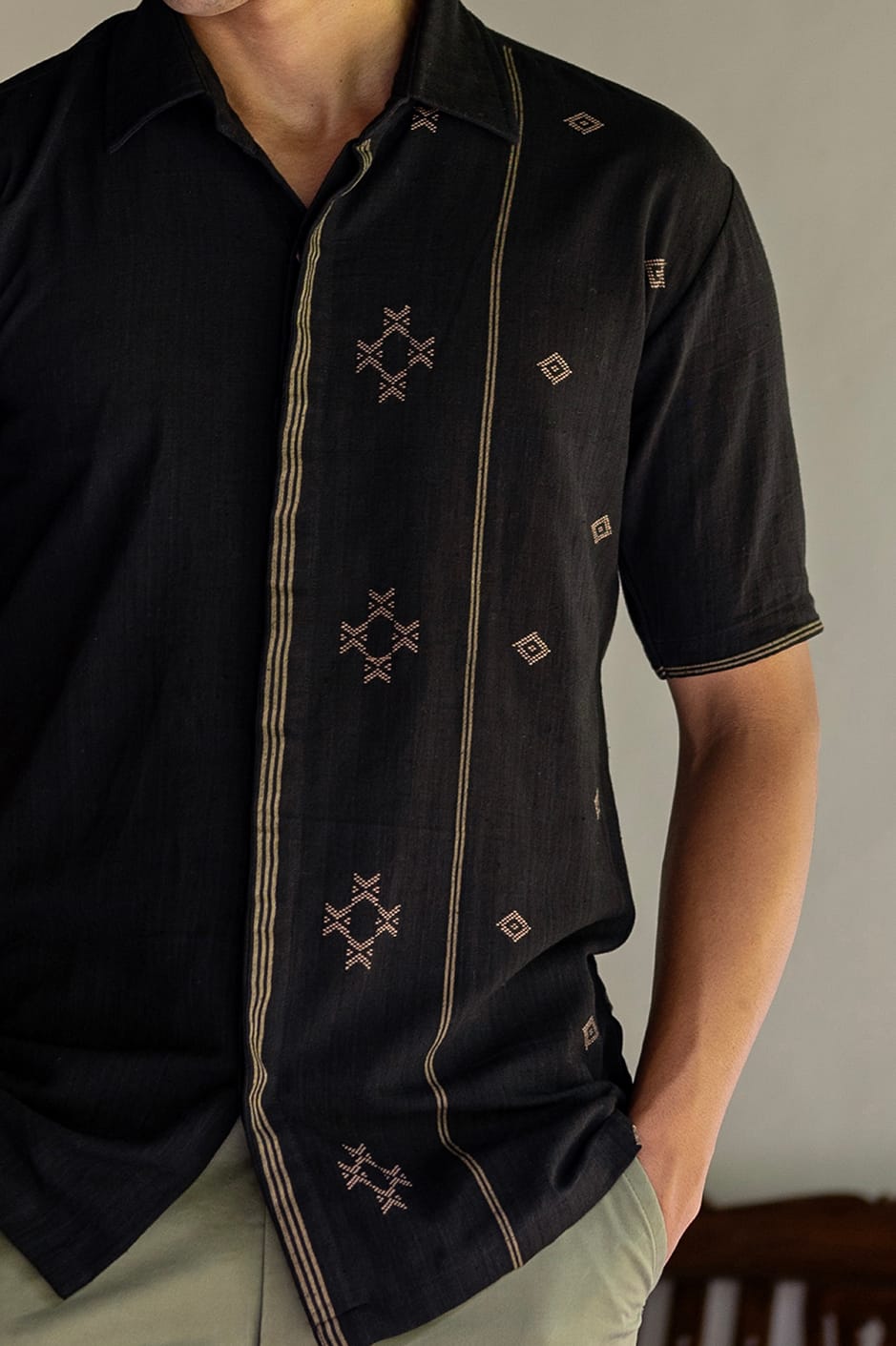 Dress in an understated festive look with our Ahote Handwoven Cotton Shirt featuring a regular collar and short sleeves. Tailored to perfection is this classic fitted beige and black silhouette of handwoven cotton jamdani weave that makes for a refined, classy and easy-to-style attire.