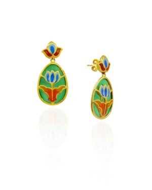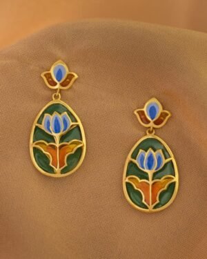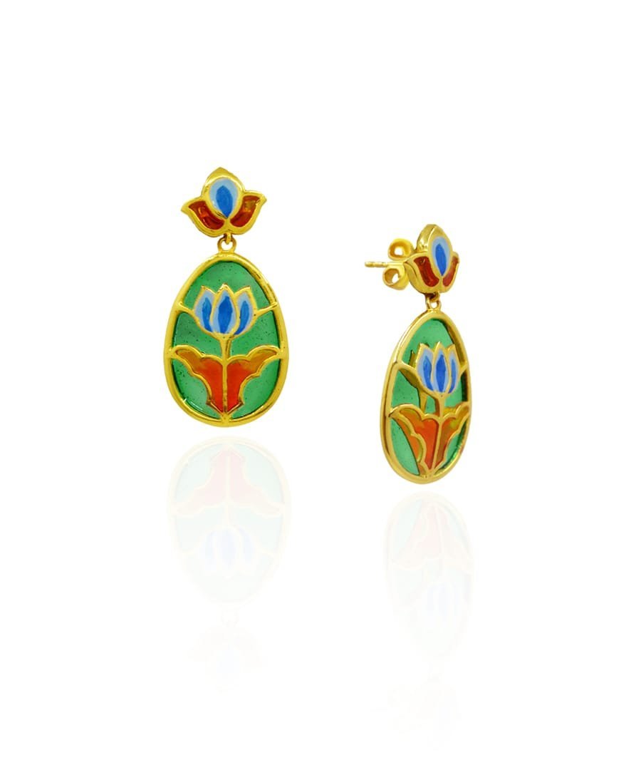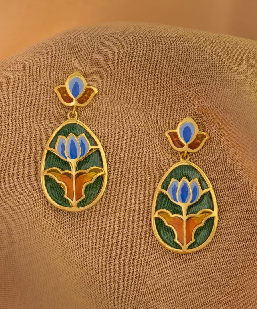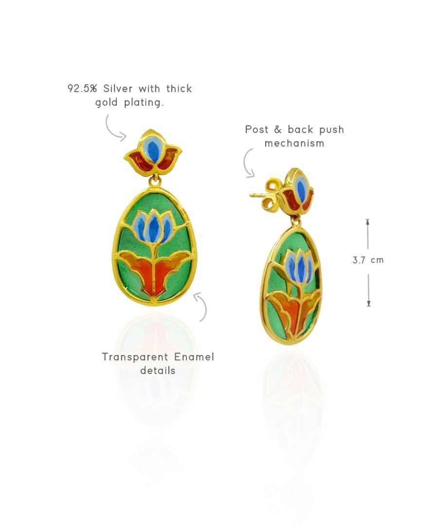 These small dangling earrings are handcrafted in 92.5% sterling silver, with thick gold plating. It has a beautiful lotus motif in the center with intricate details of transparent enamel in vibrant colors, and comes in a post and back push mechanism., Plating: Gold Plated, Metal Type: 92.5% Sterling Silver, Enamel / plating / gemstone: Transparent Enamel, Lock Mechanism: Post and push back, Measurement cm : 3.7 cm , Measurement inches: 1.45 inch, Care Instruction: Keep away from water, perfume and other liquids. Do not use any cleaning agents. Clean when storing in the provided pouches. Store them in moisture free areas and keep them away from water and liquid fragrances.