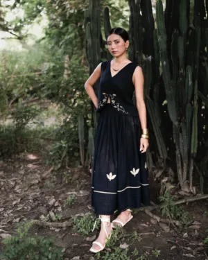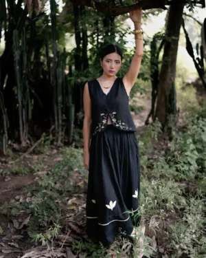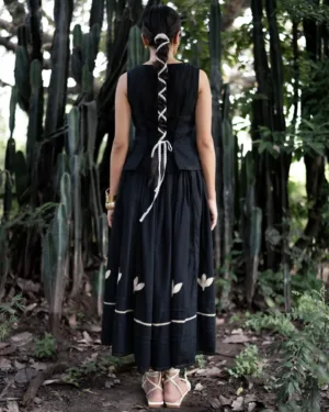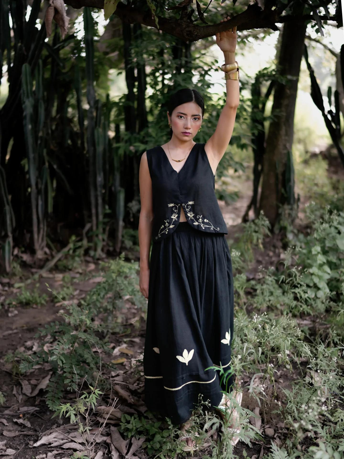 Crafted in breathable linen, this black skirt features intricate appliqué and lace details at the hem. With soft pleats, a comfortable elasticated waist, and a full flared silhouette, it blends artisanal charm with effortless wearability.