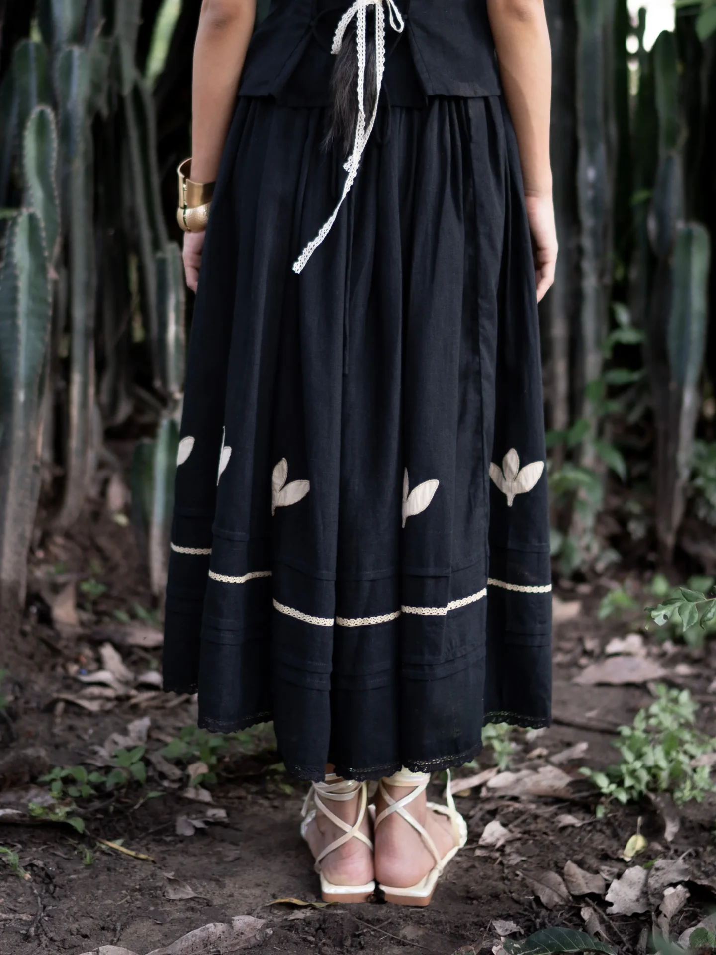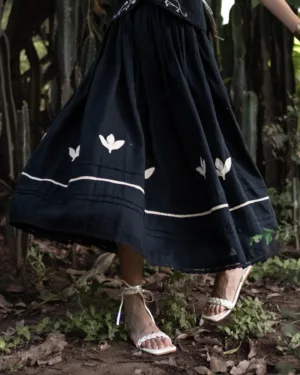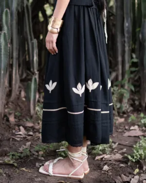Crafted in breathable linen, this black skirt features intricate appliqué and lace details at the hem. With soft pleats, a comfortable elasticated waist, and a full flared silhouette, it blends artisanal charm with effortless wearability.
