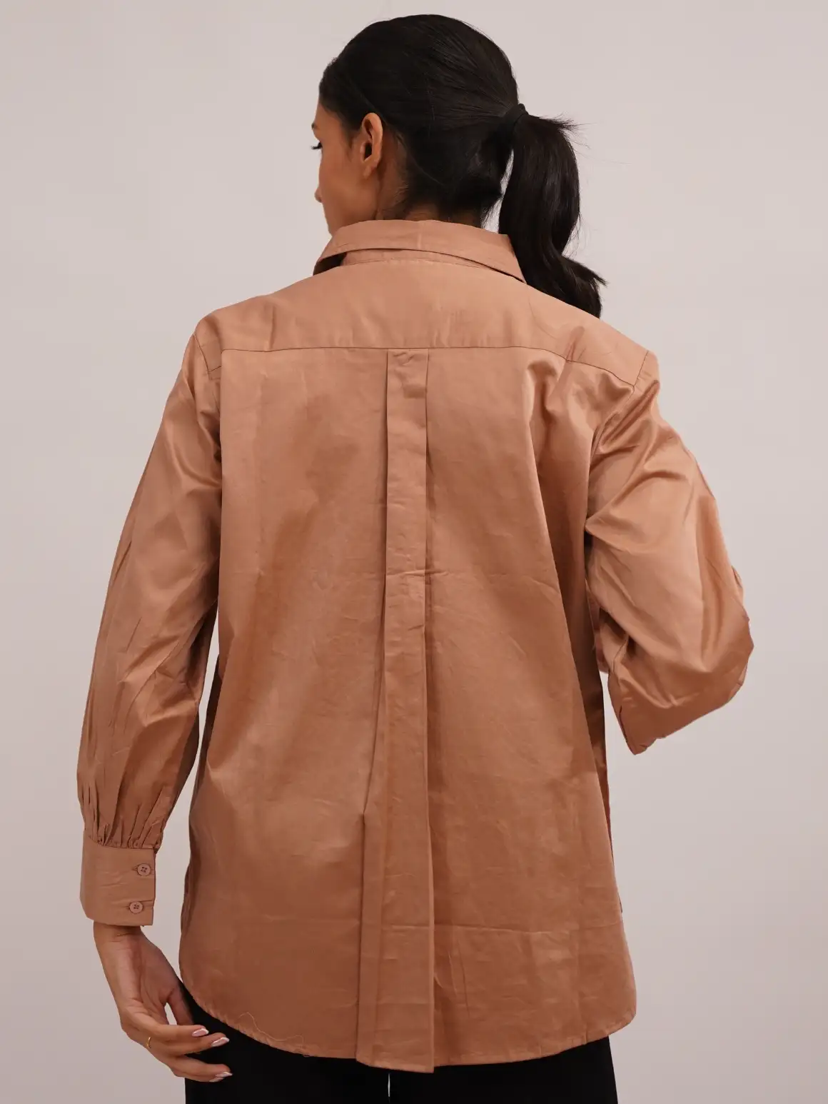 This amber-toned shirt captures the essence of grounded beauty with intricate lilac thread embroidery that flows like hand-drawn art across its surface. The soft satin-cotton texture adds a natural sheen, making it both contemporary and timeless. A perfect blend of ease and sophistication, this piece embodies the calm confidence of the modern woman.