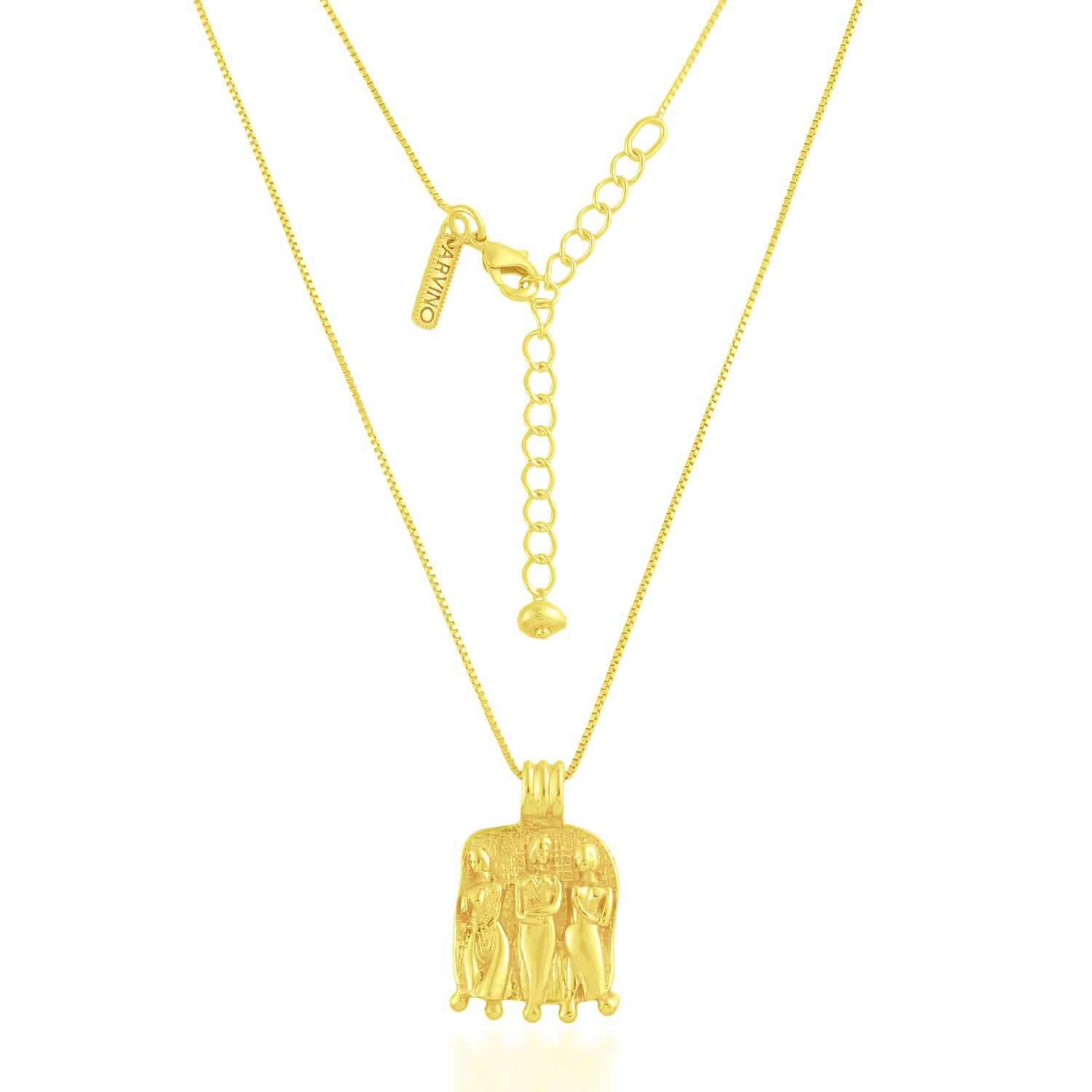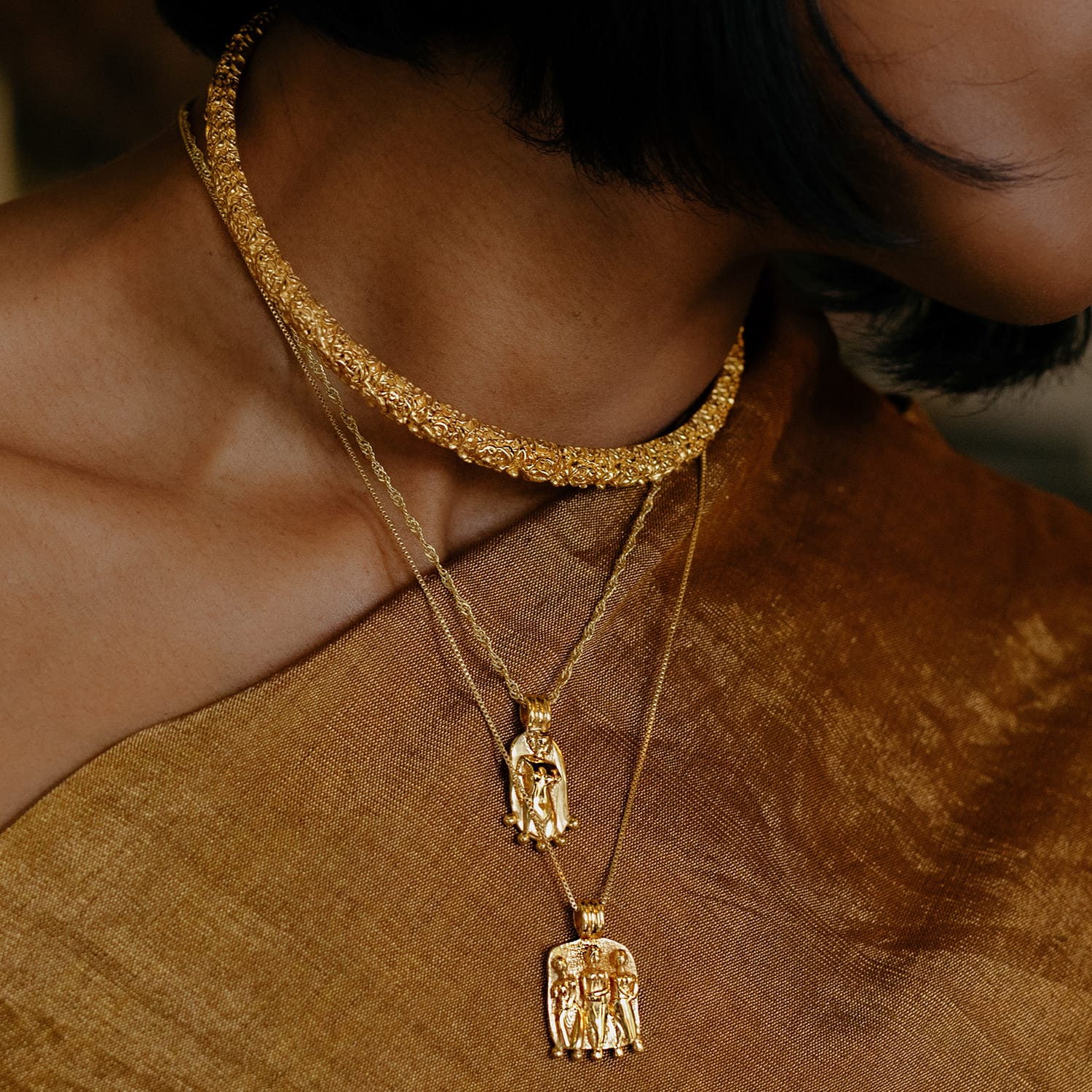 This spiritual necklace showcases an ancient goddess-inspired motif, finished with 22KT real gold plating on a premium brass alloy base. The intricate detailing and antique-inspired finish reflect devotion, strength, and cultural beauty while offering a rich, luxurious appearance.