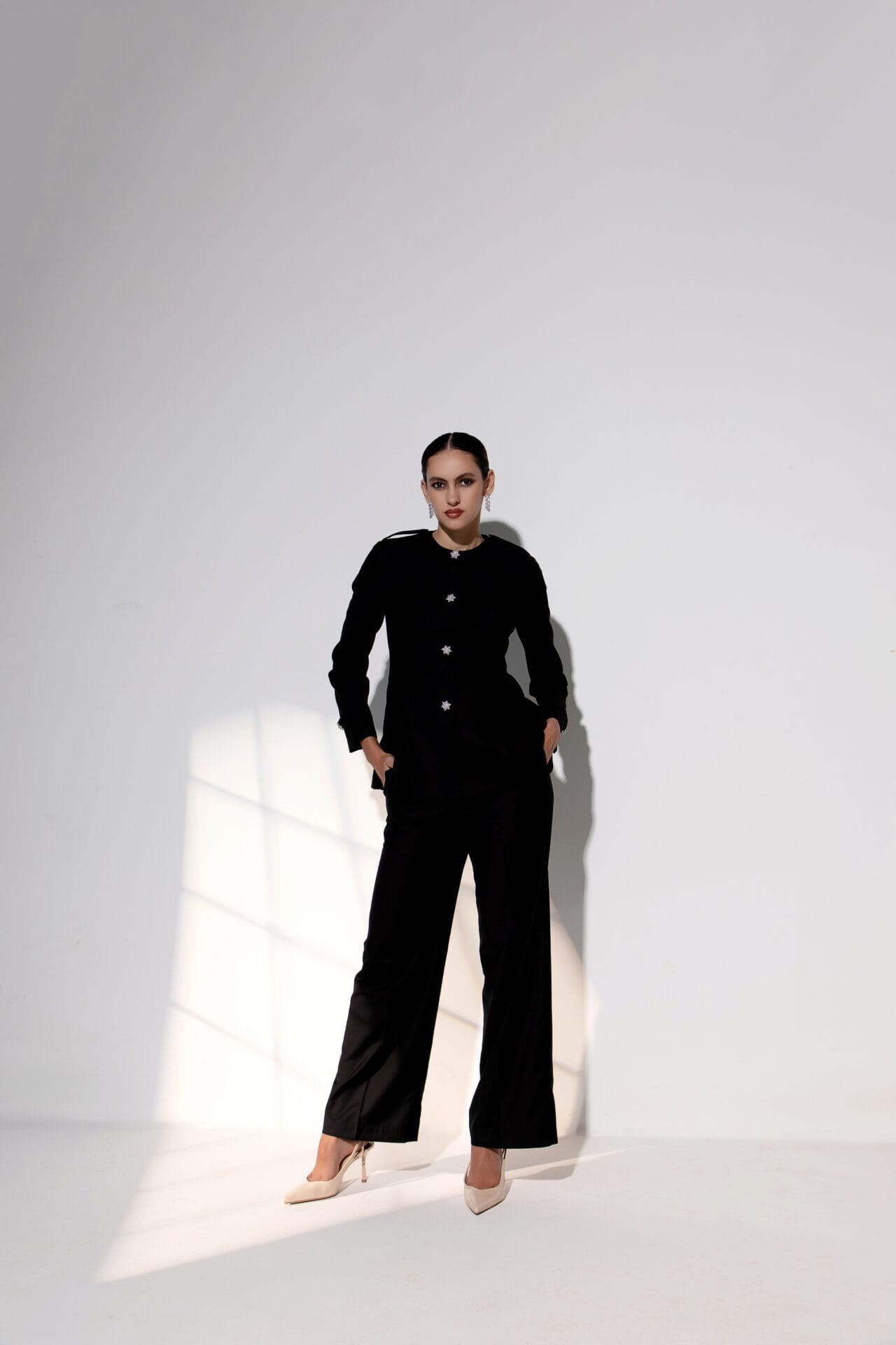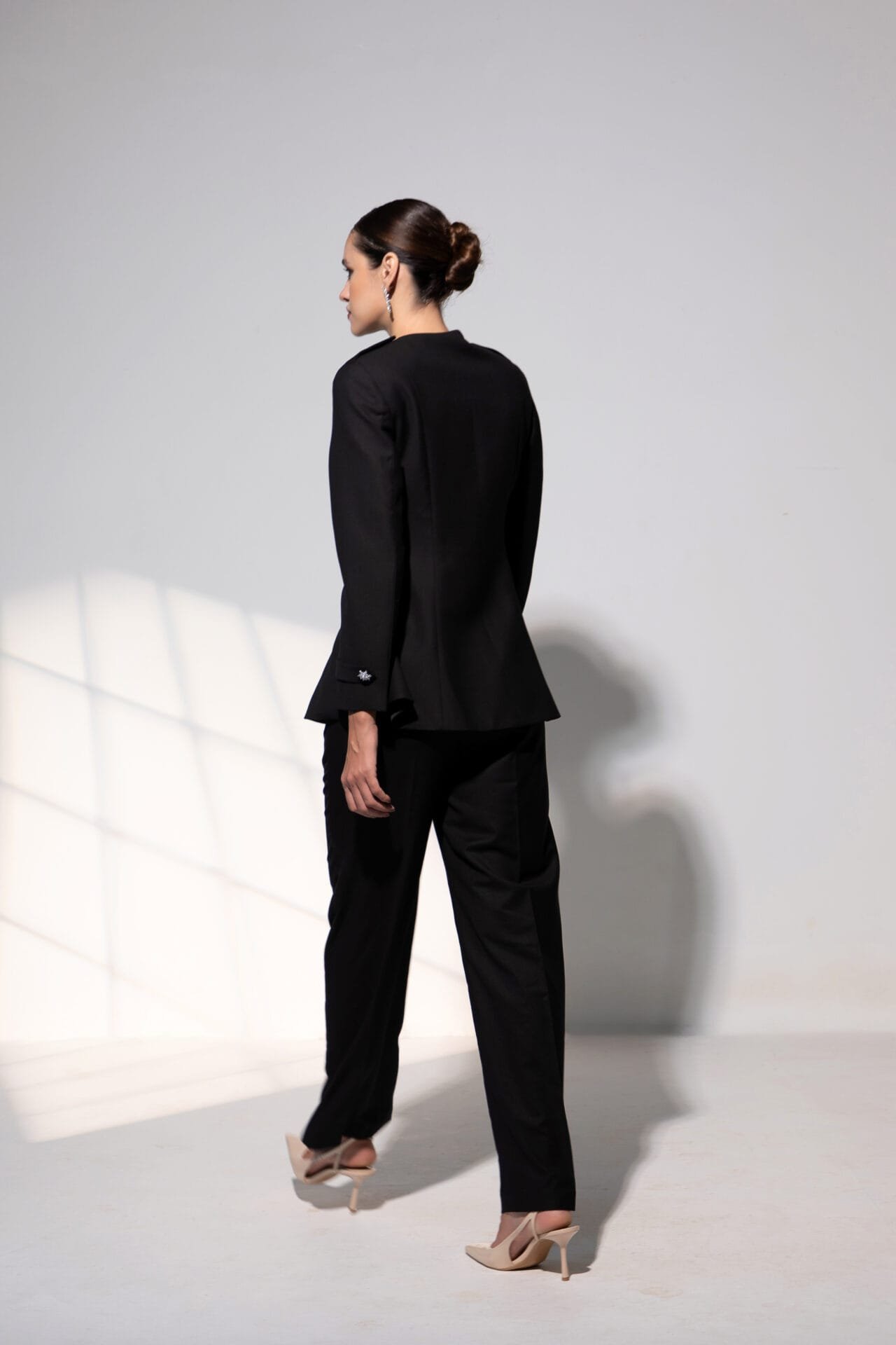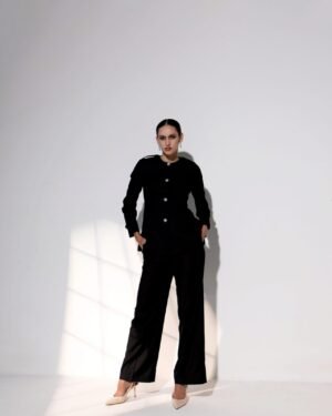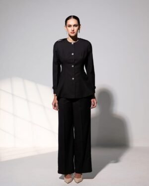 Paired with tailored trousers featuring a concealed waistband, side pockets, and a sleek side zipper, the set moves with quiet confidence and grace.