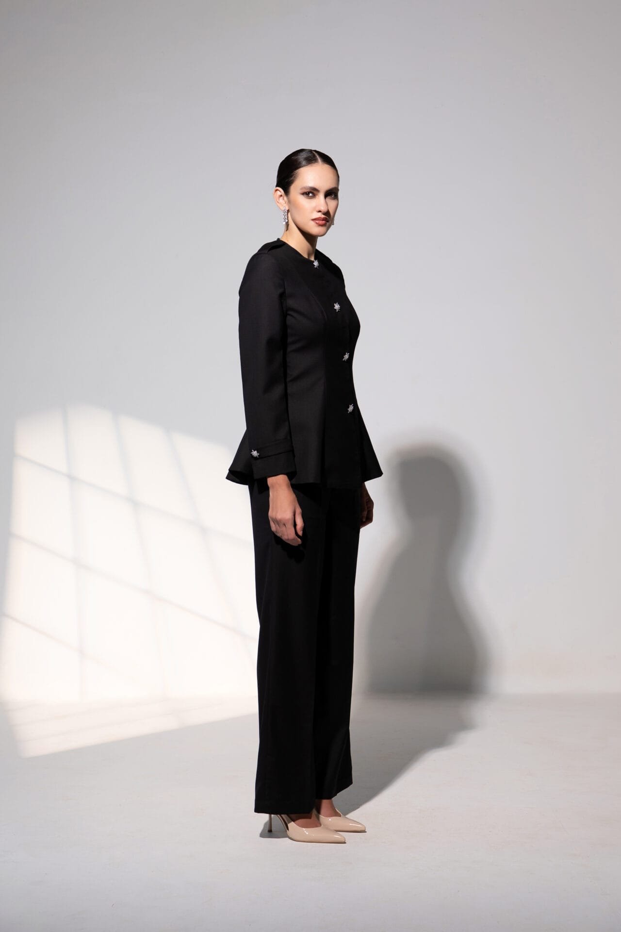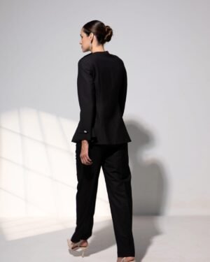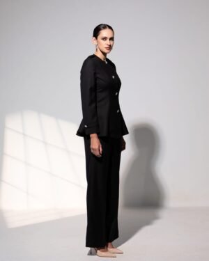 Minimal yet meticulously detailed, the Arabella co-ord set embodies modern sophistication with a sculpted ease. The structured top features a clean round neckline, subtle epaulettes, and delicate floral stone buttons that add a whisper of embellishment. The gentle peplum flare defines the waist, creating a refined, feminine silhouette.