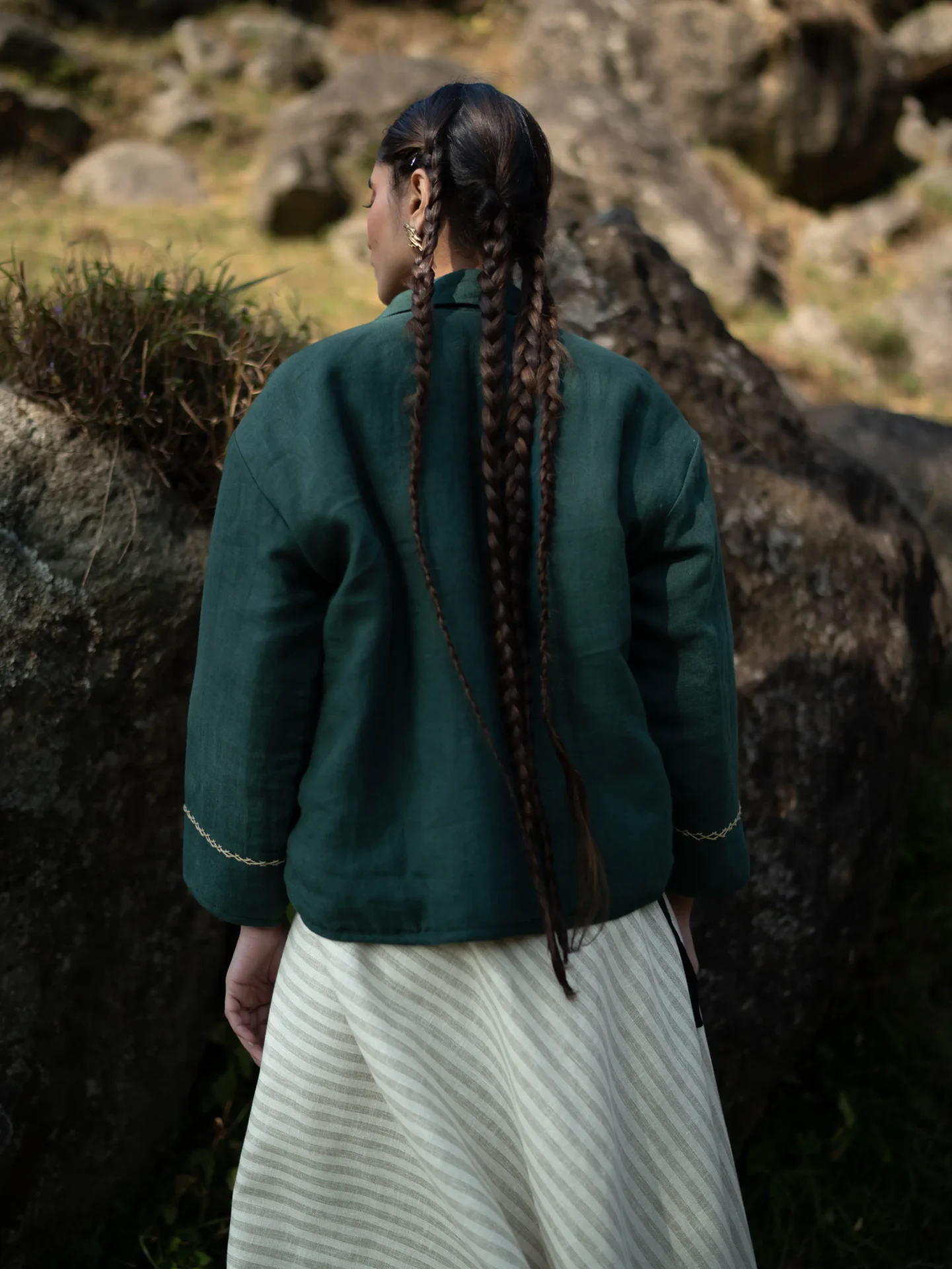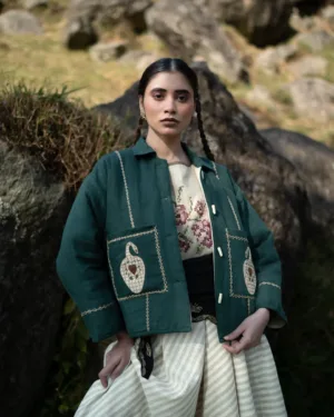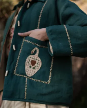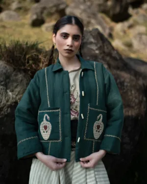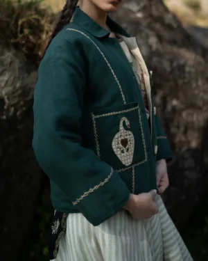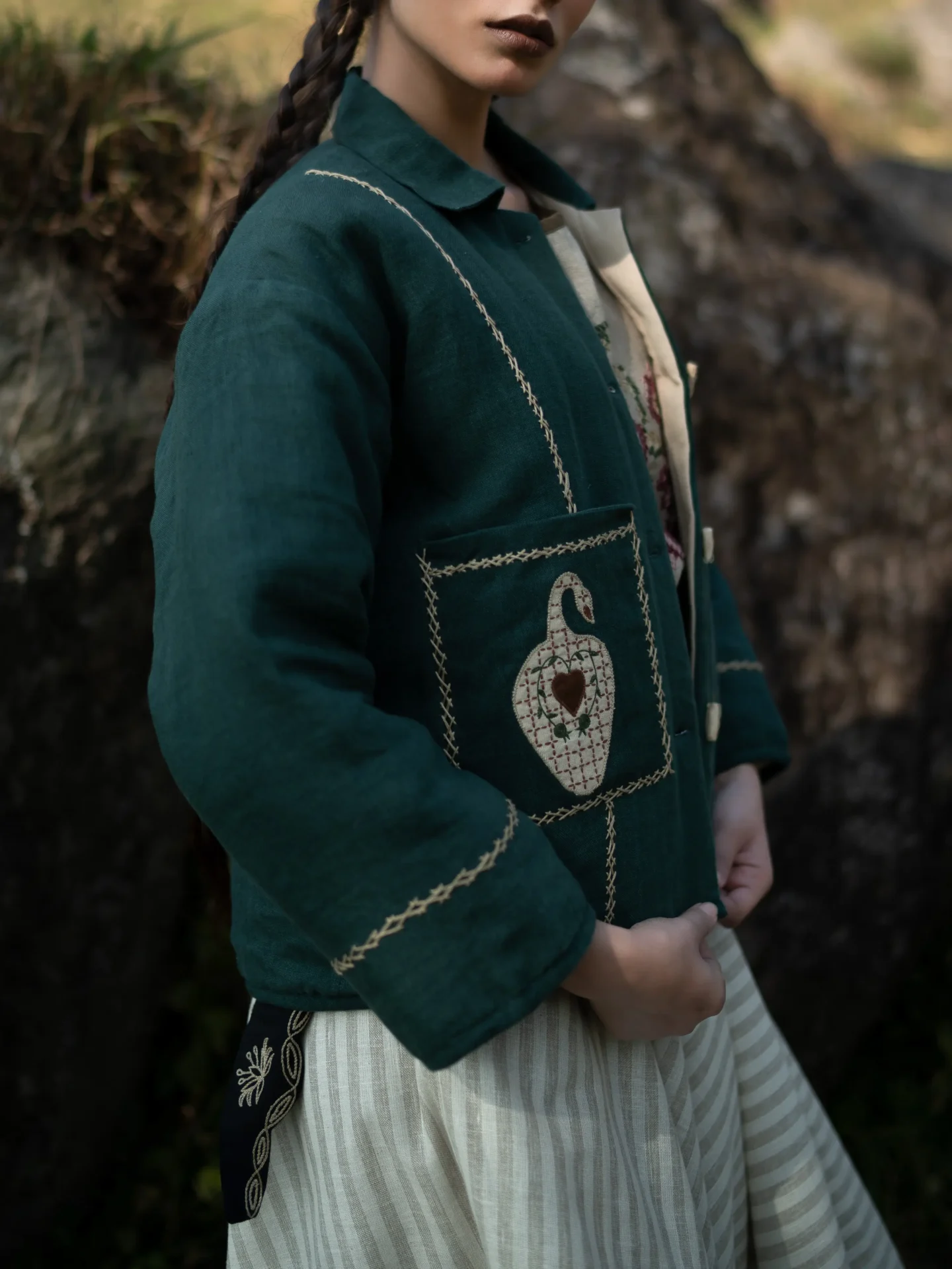 Aria appliqué hand-embroidered quilted linen jacket. It features duck appliqué work on both pockets detailing along the front and cuff. It is fully lined with soft cotton fabric.