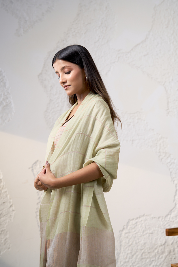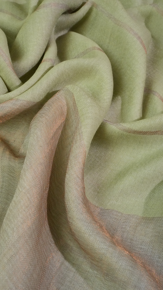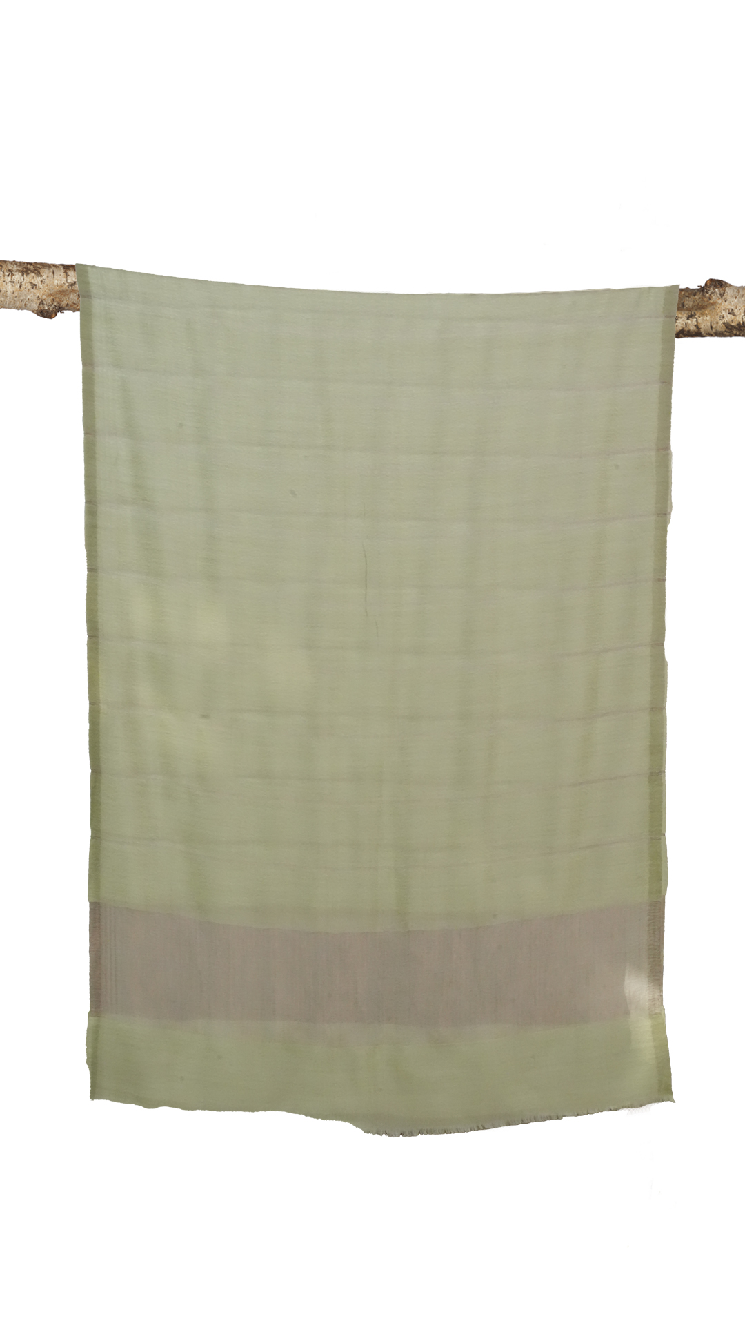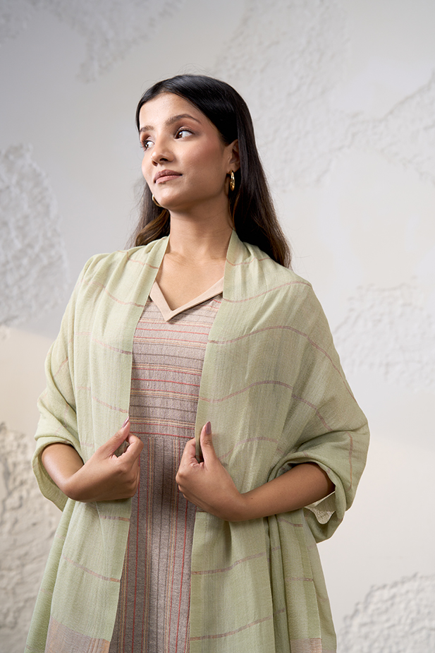 The Aria handwoven stole is made of fine cashmere with a green background and an array of zaree stripes in the front, giving it an authentic cultural look and feel.