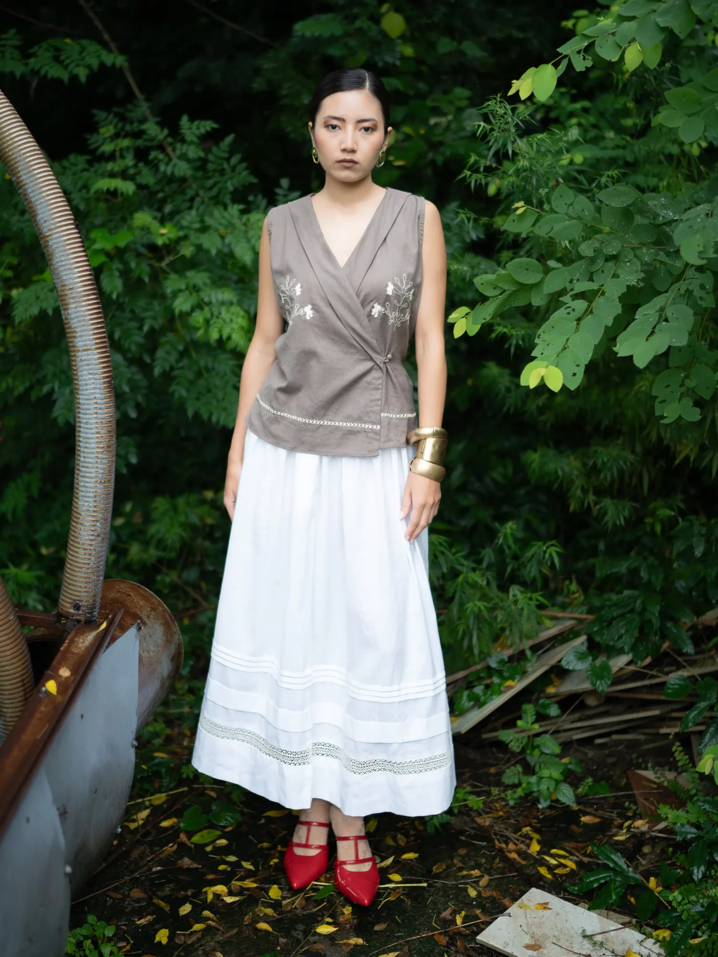 Crafted in breathable cotton, this white skirt features intricate hand pleats and lace details at the hem. With both sides pocket, a comfortable elasticated waist, and a full flared silhouette, it blends artisanal charm with effortless wearability.