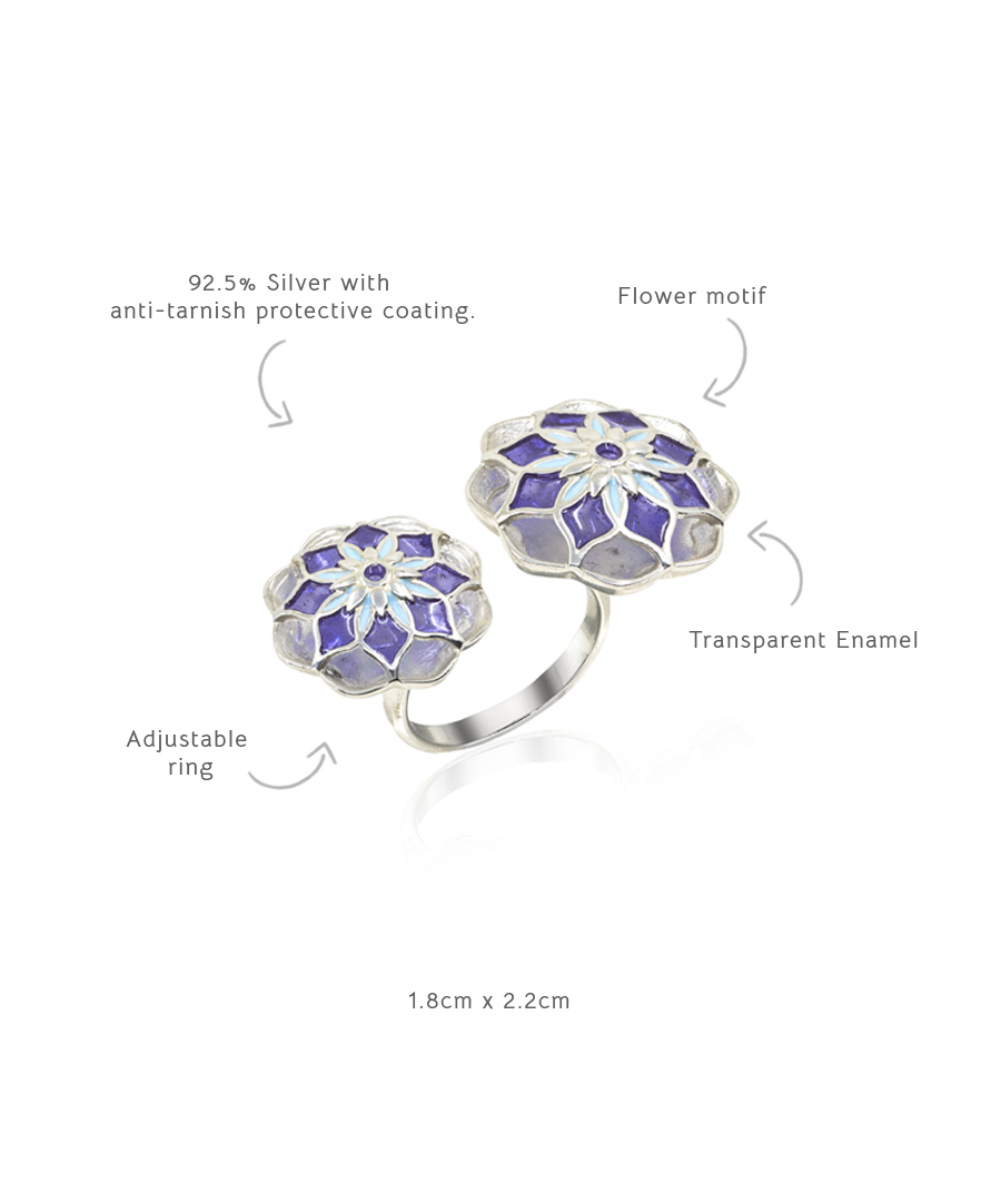 This ring is a statement piece, and is adjustable ring size, handcrafted in 92.5% sterling silver & has anti- tarnish protective coating.. The ring has transparent enameling details in vibrant color with flower motif design and secured with a high quality protective coating. , Plating: Silver Anti-tarnish, Metal Type: 92.5% Sterling Silver, Enamel / plating / gemstone: Transparent Enamel, Lock Mechanism: Adjustable Ring, Measurement cm : 1.8cm x 2.2 , Measurement inches: 0 .70 inches x 0.86 inches, Care Instruction: Keep away from water, perfume and other liquids. Do not use any cleaning agents. Clean when storing in the provided pouches. Store them in moisture free areas and keep them away from water and liquid fragrances.