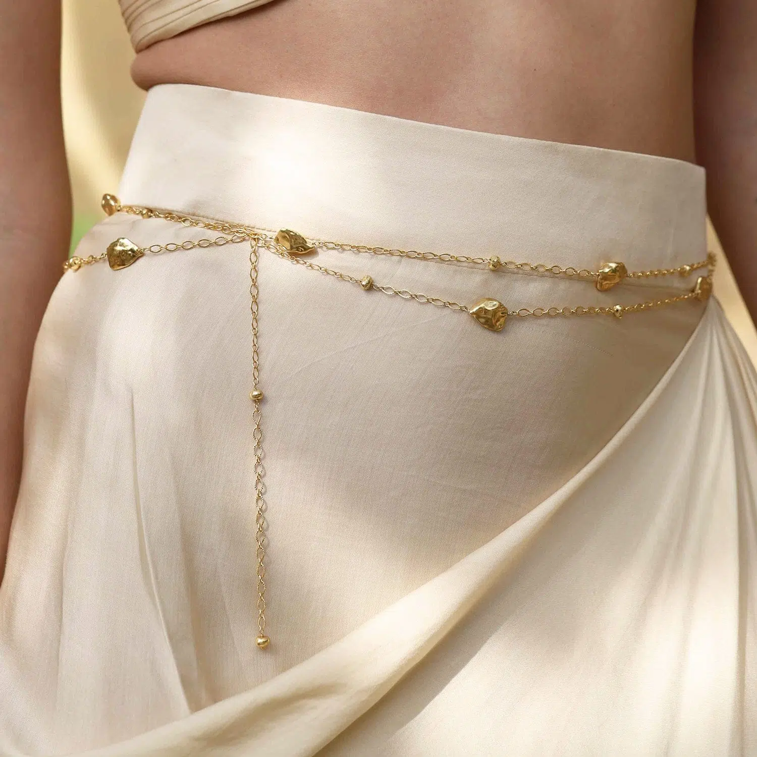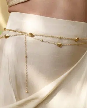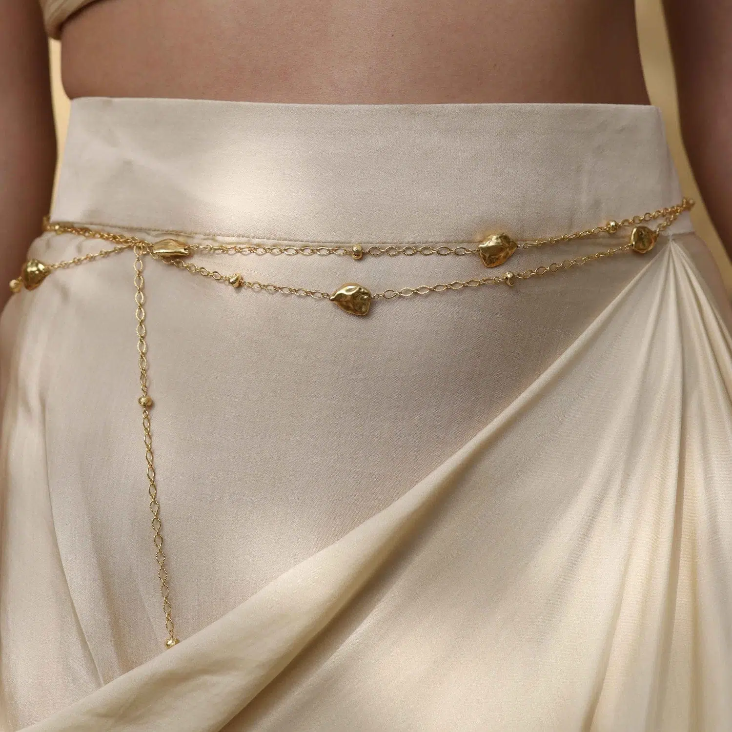 Elevate your look with this Asymmetric Asteroid Belly Chain, designed for women who love bold, modern waist jewelry.Inspired by organic asteroid-like forms and asymmetrical detailing, this waist chain is crafted from premium brass alloy with 22KT real gold plating, offering lasting shine and a refined finish. The lightweight and adjustable fit ensures comfort throughout the day.Perfect to style as a waist chain or stomach chain with sarees, lehengas, dresses, or beachwear, this piece adds effortless glamour to festive, party, and casual outfits.