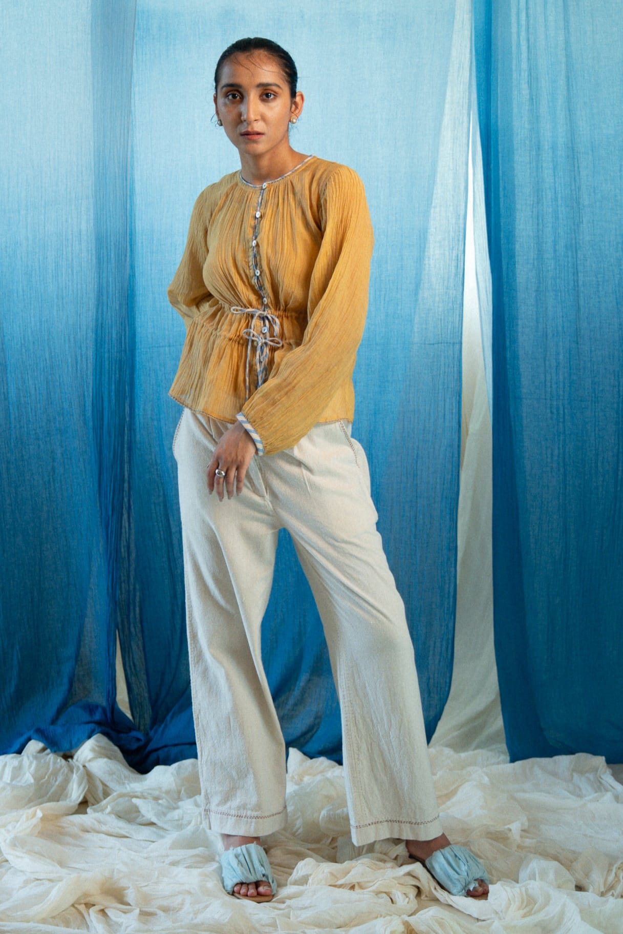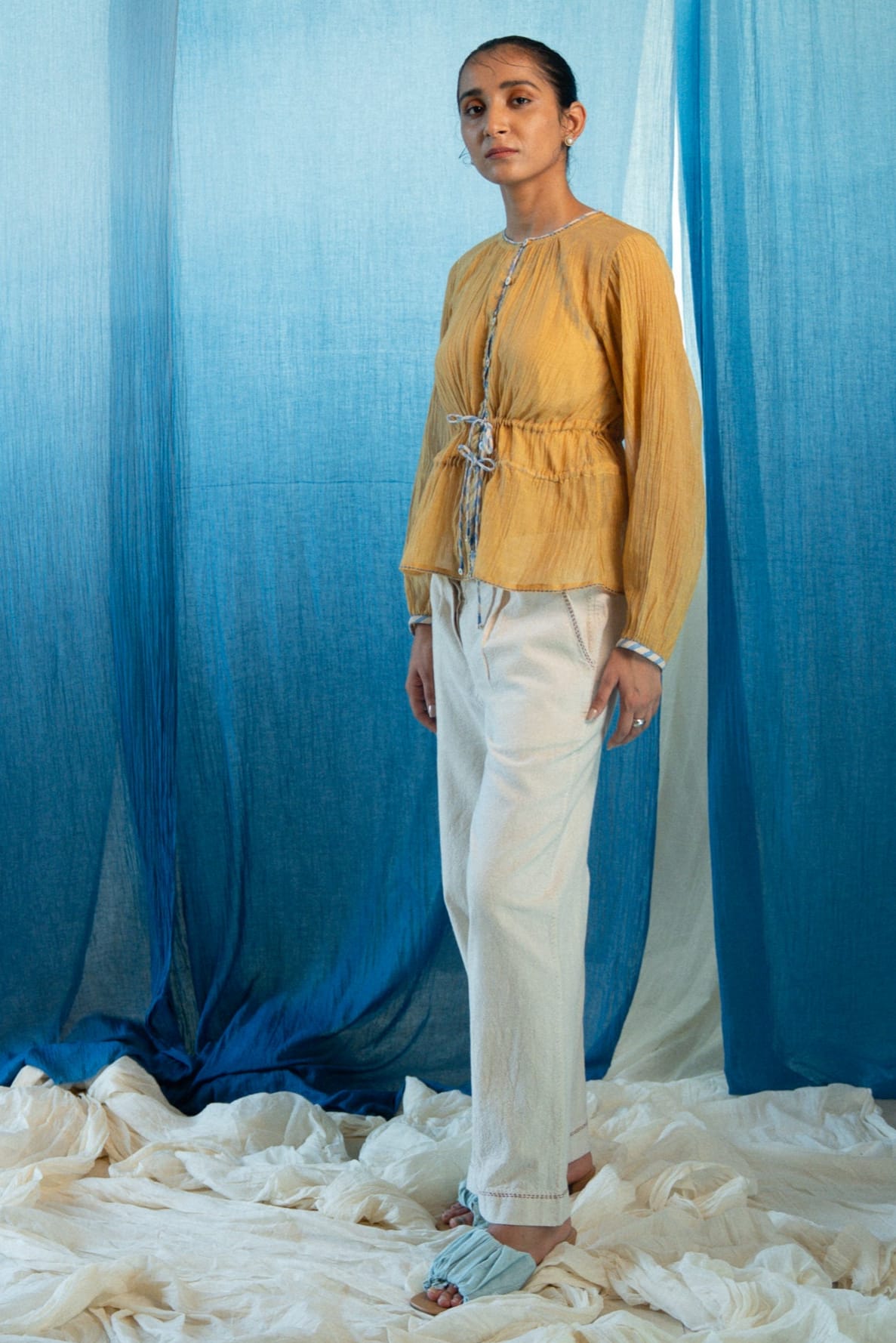 Subtle gathers and a gentle flare shape the blouse, making it light, sheer, and easy to layer.
