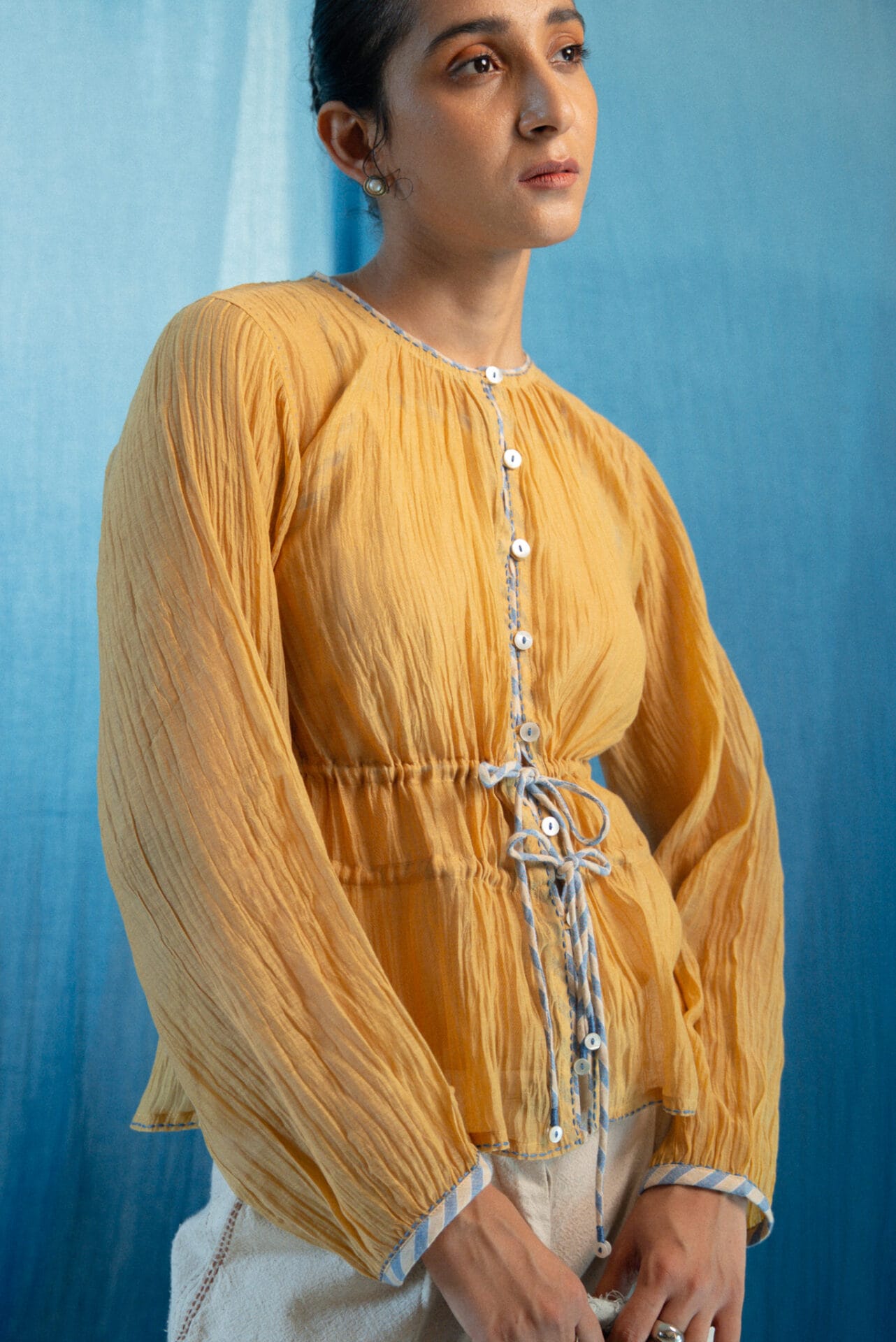 Made from 100% handwoven chanderi and natural materials, this sheer AY Chanderi Ruched Blouse is azo-free dyed in a rich ochre shade. It features contrast piping, and is accentuated with hand-done Kantha work. Loop buttons run down the front.