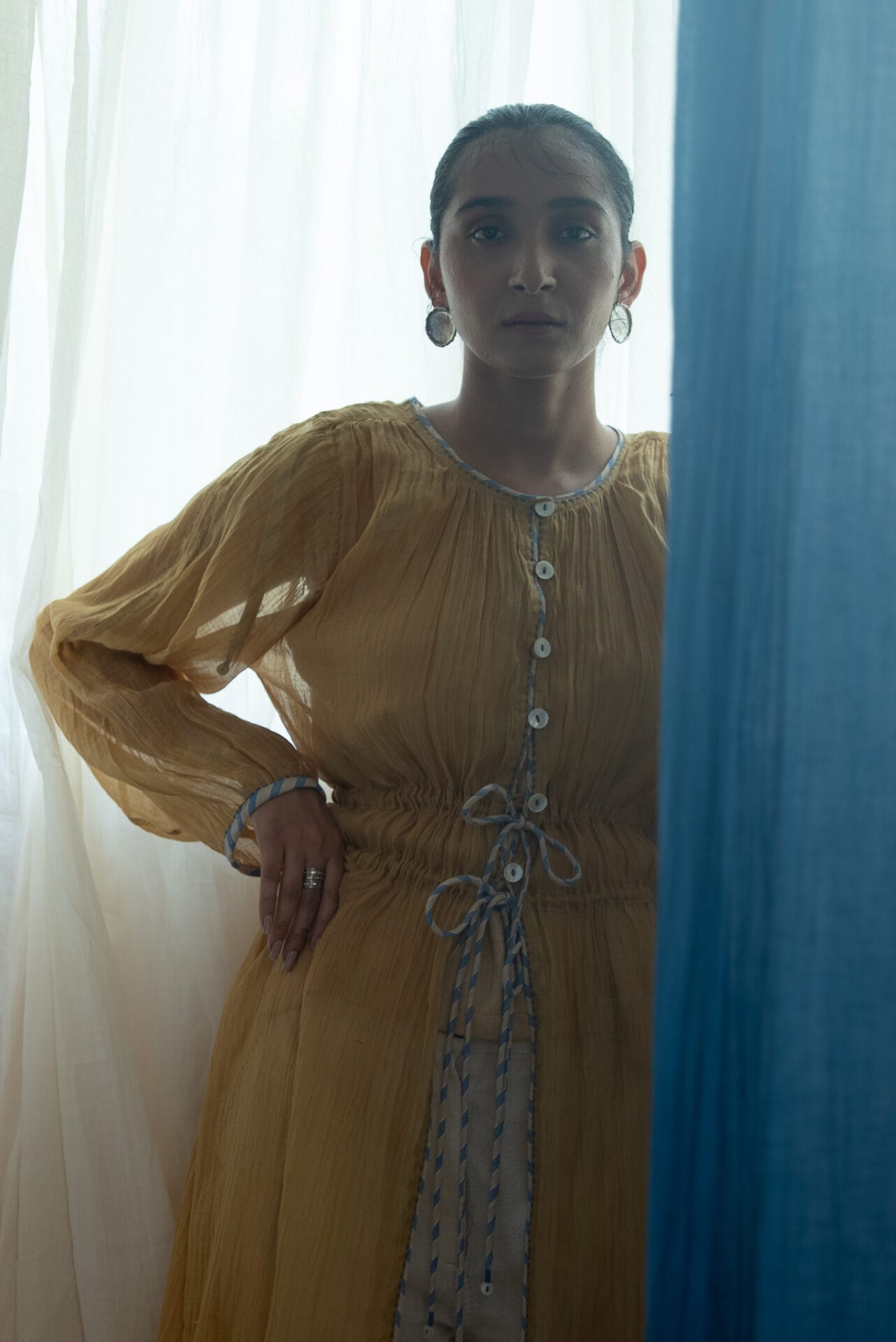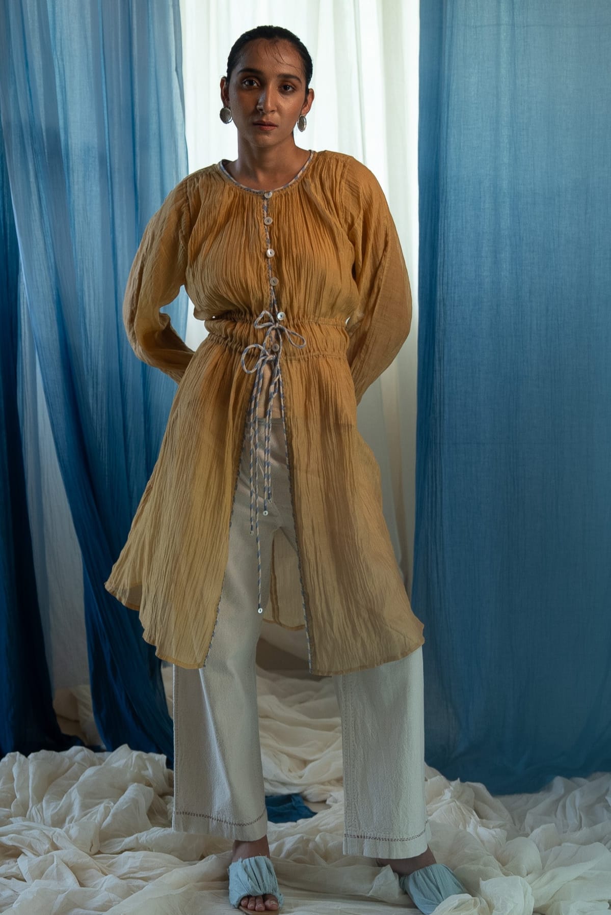Made from 100% handwoven chanderi and natural materials, this sheer AY Chanderi Ruched Dress is azo-free dyed in a rich ochre shade. It features contrast piping, and is accentuated with hand-done Kantha work. Loop buttons run down the front.