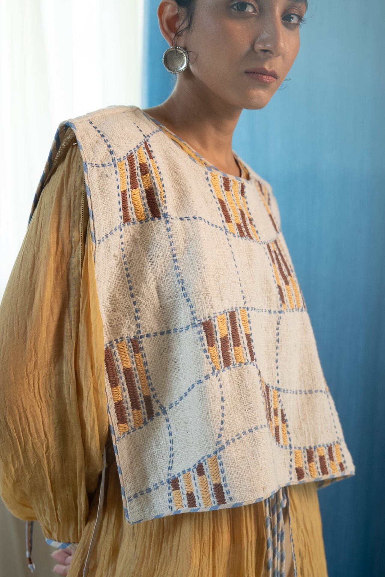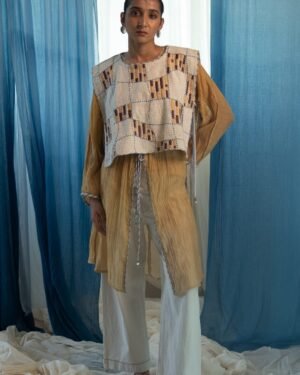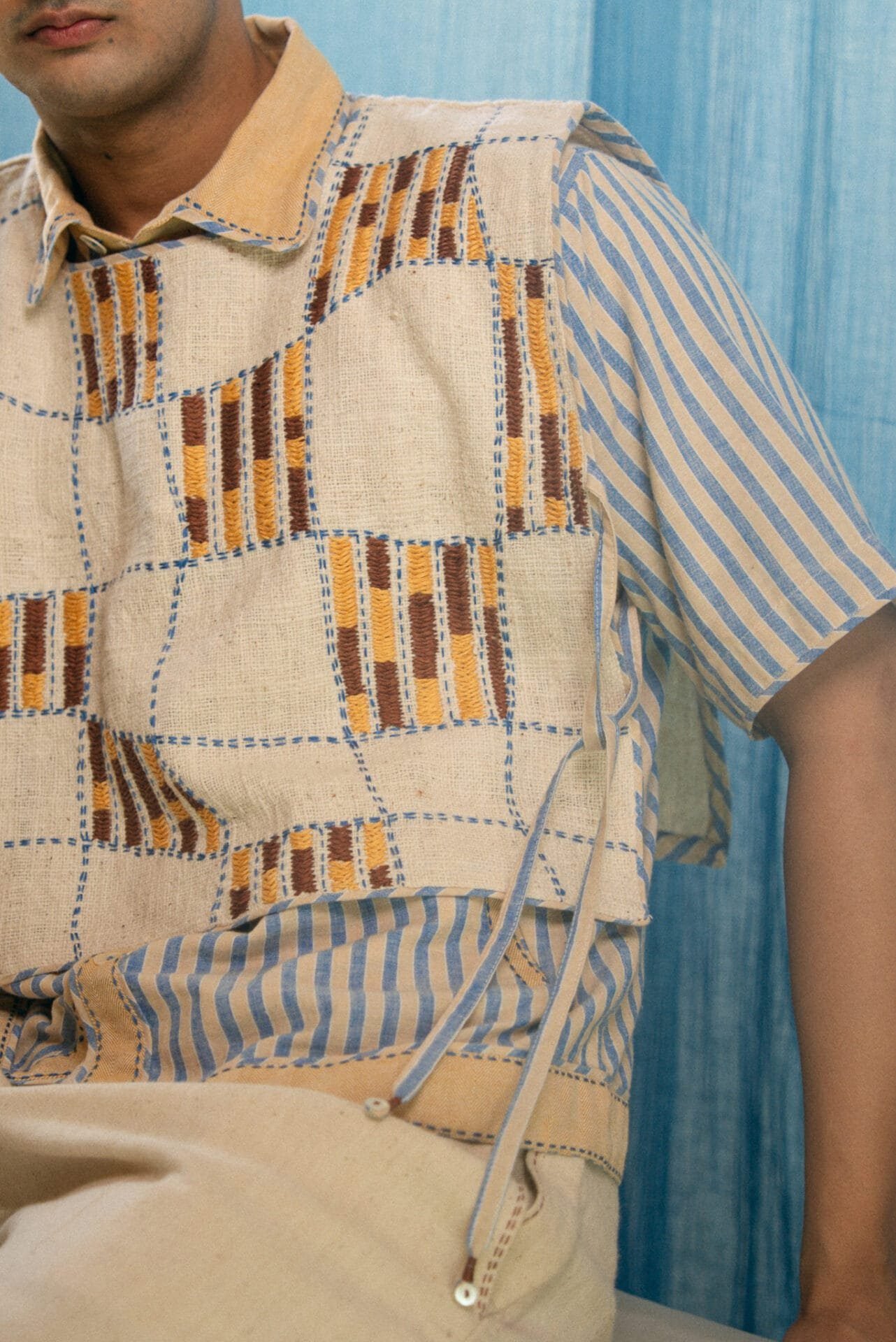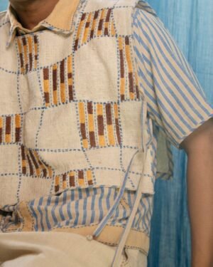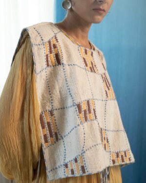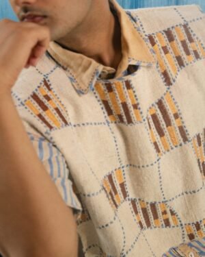 Made from 100% cotton fibres and natural materials, the AY Unisex Bib is crafted in undyed and unbleached in zero count handwoven cotton. The piece features hand-done Kantha embroidery with criss-cross stitches, forming a distorted check pattern across the surface.
