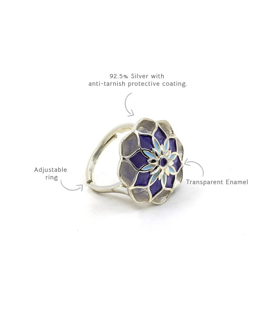 This Azizi ring is a statement piece, and is adjustable ring size, handcrafted in 92.5%? sterling silver & has anti- tarnish protective coating. The ring has beautiful enameling details in vibrant color and secured with a high quality protective coating., Plating: Silver Anti-tarnish, Metal Type: 92.5% Sterling Silver, Enamel / plating / gemstone: Transparent Enamel, Lock Mechanism: Adjustable Ring, Measurement cm : 2.2 cm , Measurement inches: 0 .86 inch , Care Instruction: Keep away from water, perfume and other liquids. Do not use any cleaning agents. Clean when storing in the provided pouches. Store them in moisture free areas and keep them away from water and liquid fragrances.