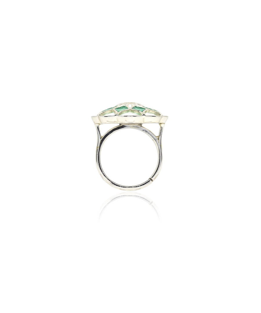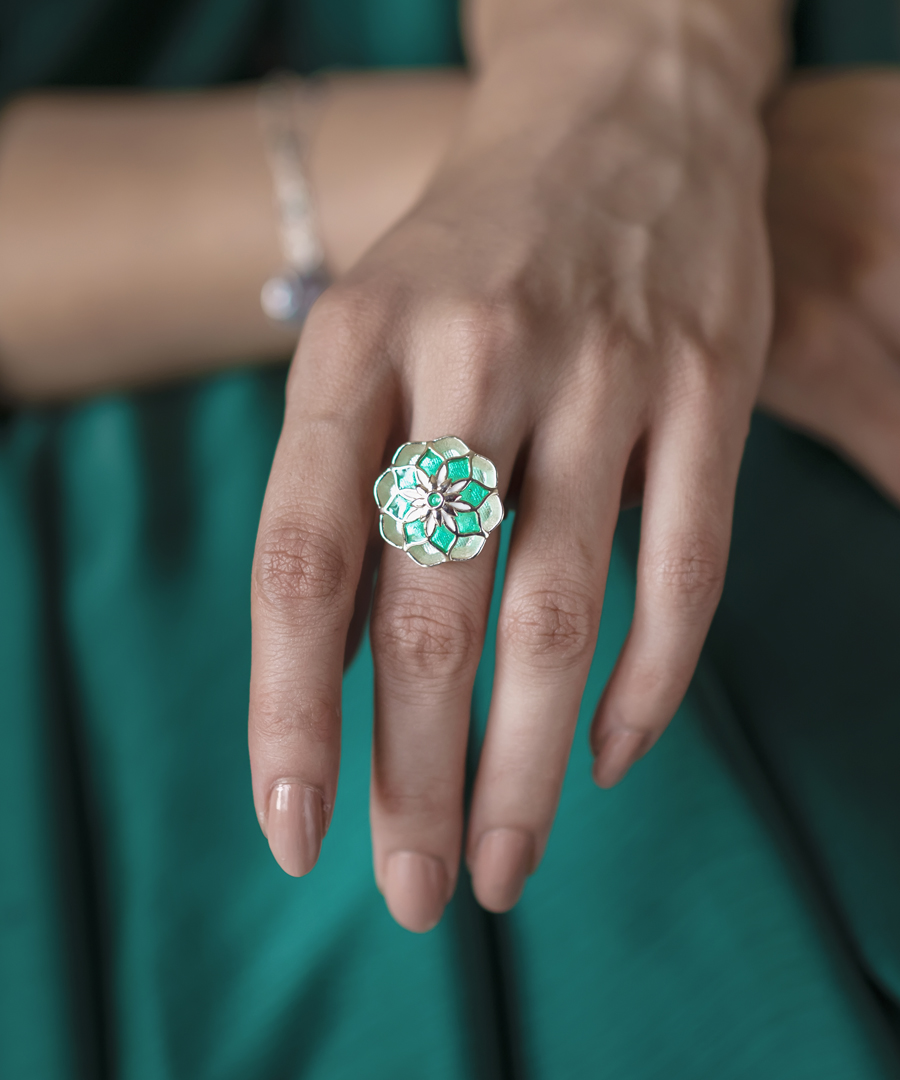 This Azizi ring is a statement piece, and is adjustable ring size, handcrafted in 92.5%? sterling silver & has anti- tarnish protective coating. The ring has beautiful enameling details in vibrant color and secured with a high quality protective coating., Plating: Silver Anti-tarnish, Metal Type: 92.5% Sterling Silver, Enamel / plating / gemstone: Transparent Enamel, Lock Mechanism: Adjustable Ring, Measurement cm : 2.2 cm , Measurement inches: 0 .86 inch , Care Instruction: Keep away from water, perfume and other liquids. Do not use any cleaning agents. Clean when storing in the provided pouches. Store them in moisture free areas and keep them away from water and liquid fragrances.