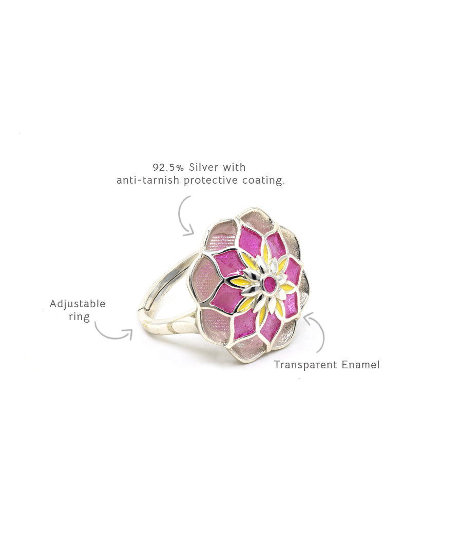 This Azizi ring is a statement piece, and is adjustable ring size, handcrafted in 92.5%? sterling silver & has anti- tarnish protective coating. The ring has beautiful enameling details in vibrant color and secured with a high quality protective coating., Plating: Silver Anti-tarnish, Metal Type: 92.5% Sterling Silver, Enamel / plating / gemstone: Transparent Enamel, Lock Mechanism: Adjustable Ring, Measurement cm : 2.2 cm , Measurement inches: 0 .86 inch , Care Instruction: Keep away from water, perfume and other liquids. Do not use any cleaning agents. Clean when storing in the provided pouches. Store them in moisture free areas and keep them away from water and liquid fragrances.