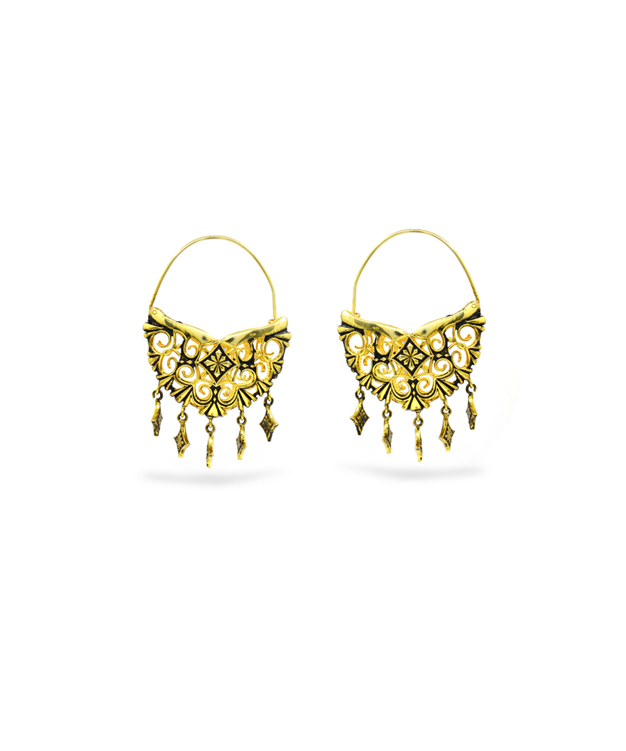 Bali hoop earrings are handcrafted in 92.5% silver with thick gold plating.These earrings are handcrafted with delicate jaali details and hanging charms in gold oxidized finish. They are super easy to wear with its ear wire mechanism., Plating: Gold Plated with oxide finish, Metal Type: 92.5% Sterling Silver, Enamel / plating / gemstone: Gold oxidised, Lock Mechanism: Ear wire lock, Measurement cm : Width – 4 cm / Lenth – 6 cm, Measurement inches: Width – 1.5 inch / Lenth – 2.5 inch, Care Instruction: Keep away from water, perfume and other liquids. Do not use any cleaning agents. Clean when storing in the provided pouches. Store them in moisture free areas and keep them away from water and liquid fragrances.