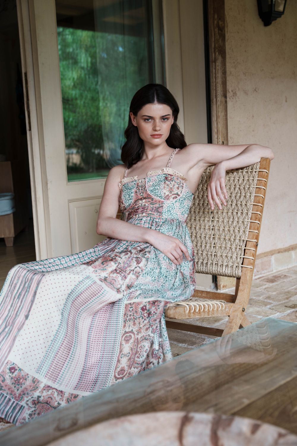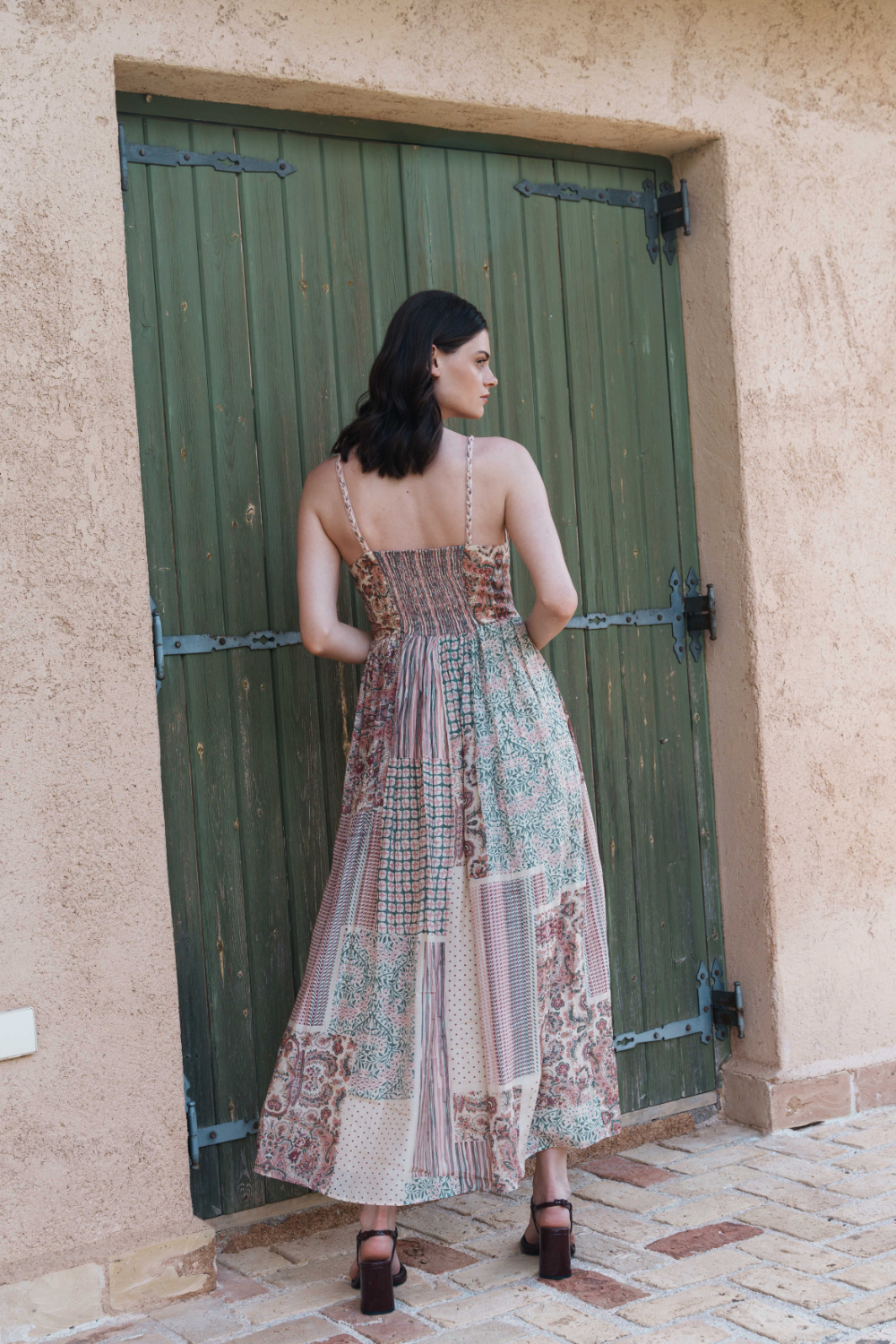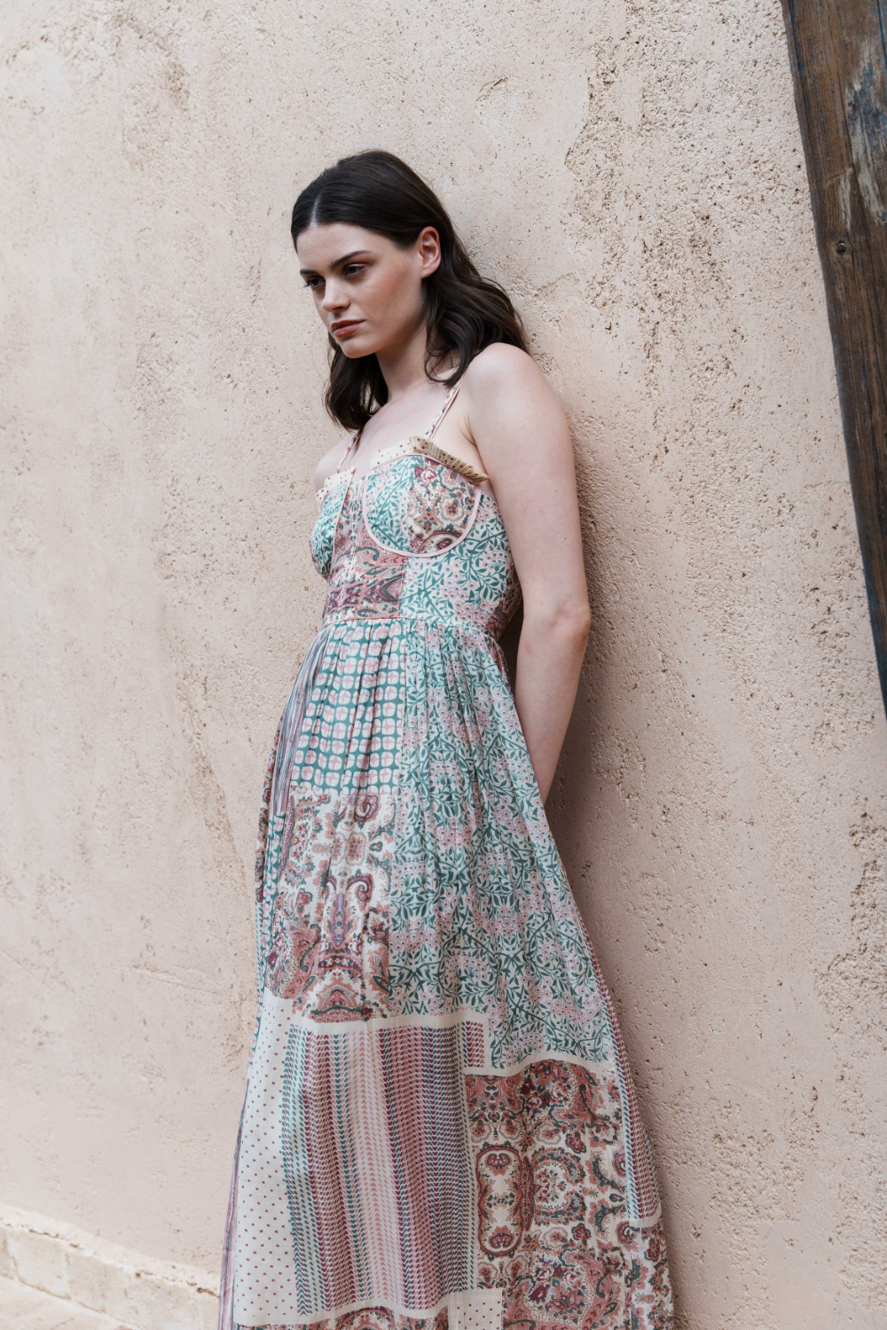 Crafted in fine fabric, this Beige spliced multi-printing gathered mul dress with belt showcases Pinnacle by Shruti Sancheti?s timeless craftsmanship and feminine grace. A perfect piece for effortless day-to-evening elegance.