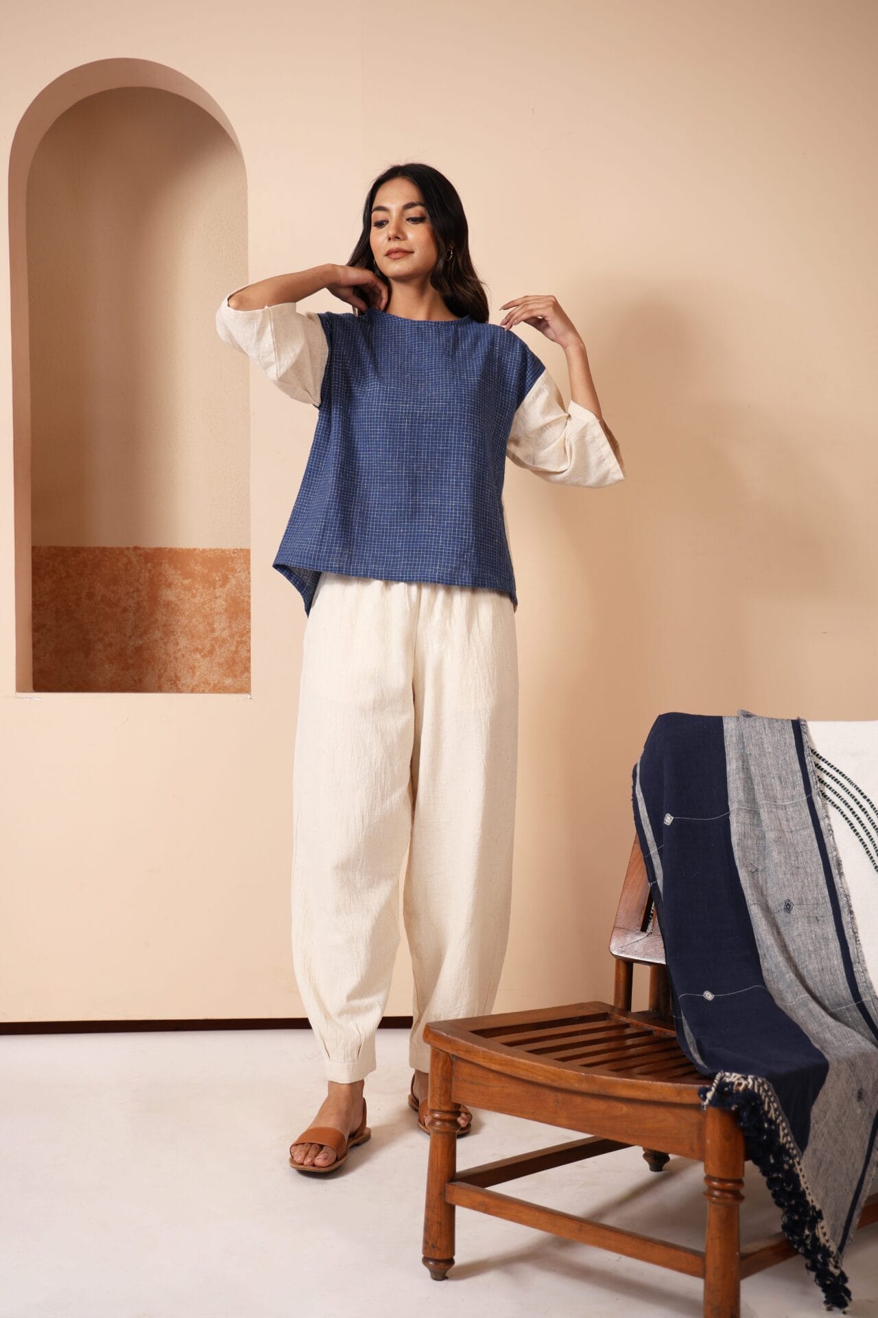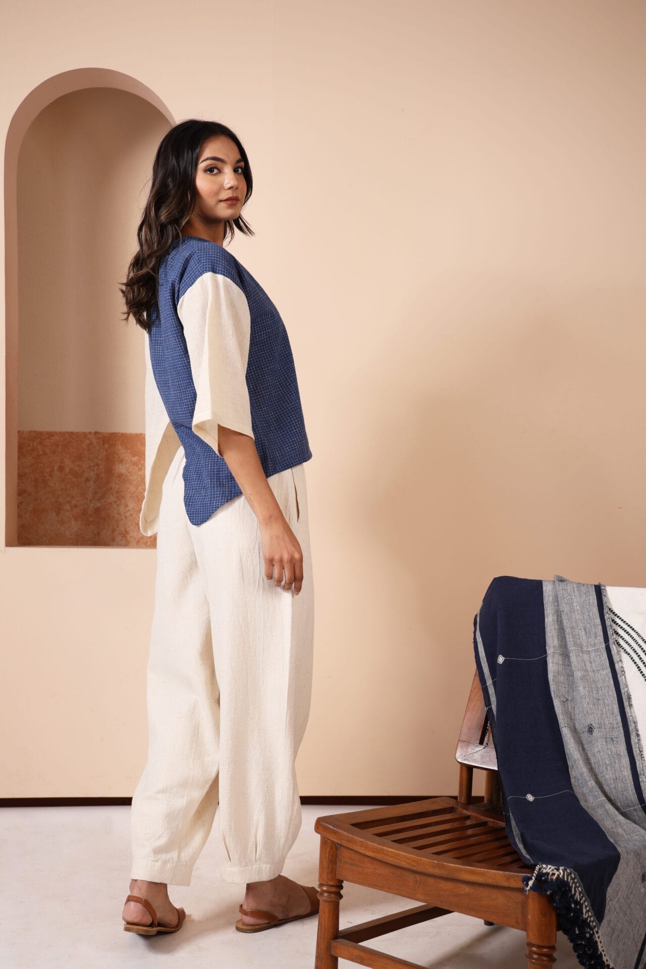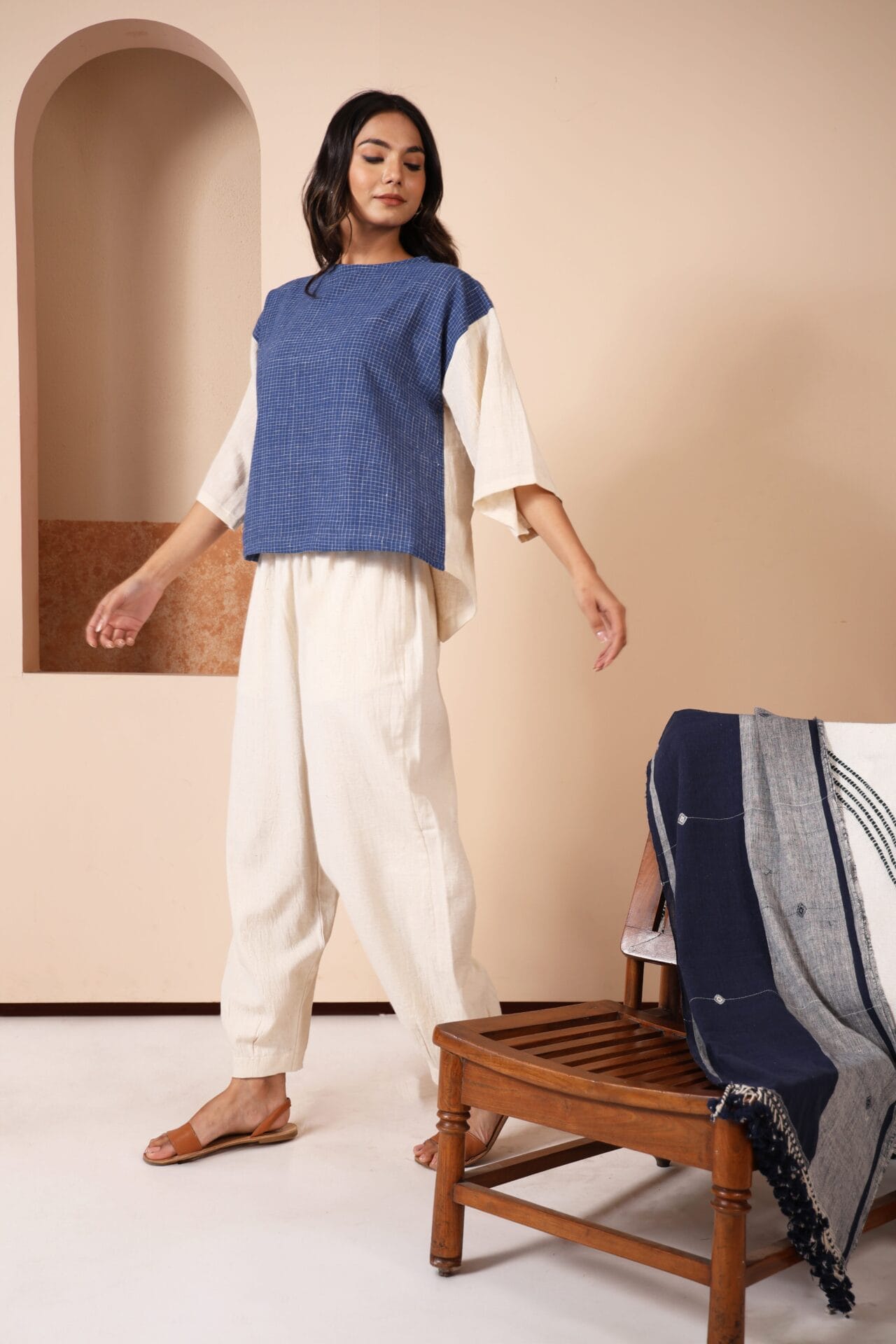 Indulge in the timeless allure of Bermuda style off white handloom pants gracefully cinched with a vibrant offwhite belt in the front and elasticated at the back. WASH INSTRUCTIONS – ONLY DRYCLEAN. Transparency & Certificate: Made in India with care, using natural dyes and produced in small batches with ISO certification. Shipping Courier charges DOMESTIC(IN INDIA) : ?500/KG, INTERNATIONAL : ?3000/KG