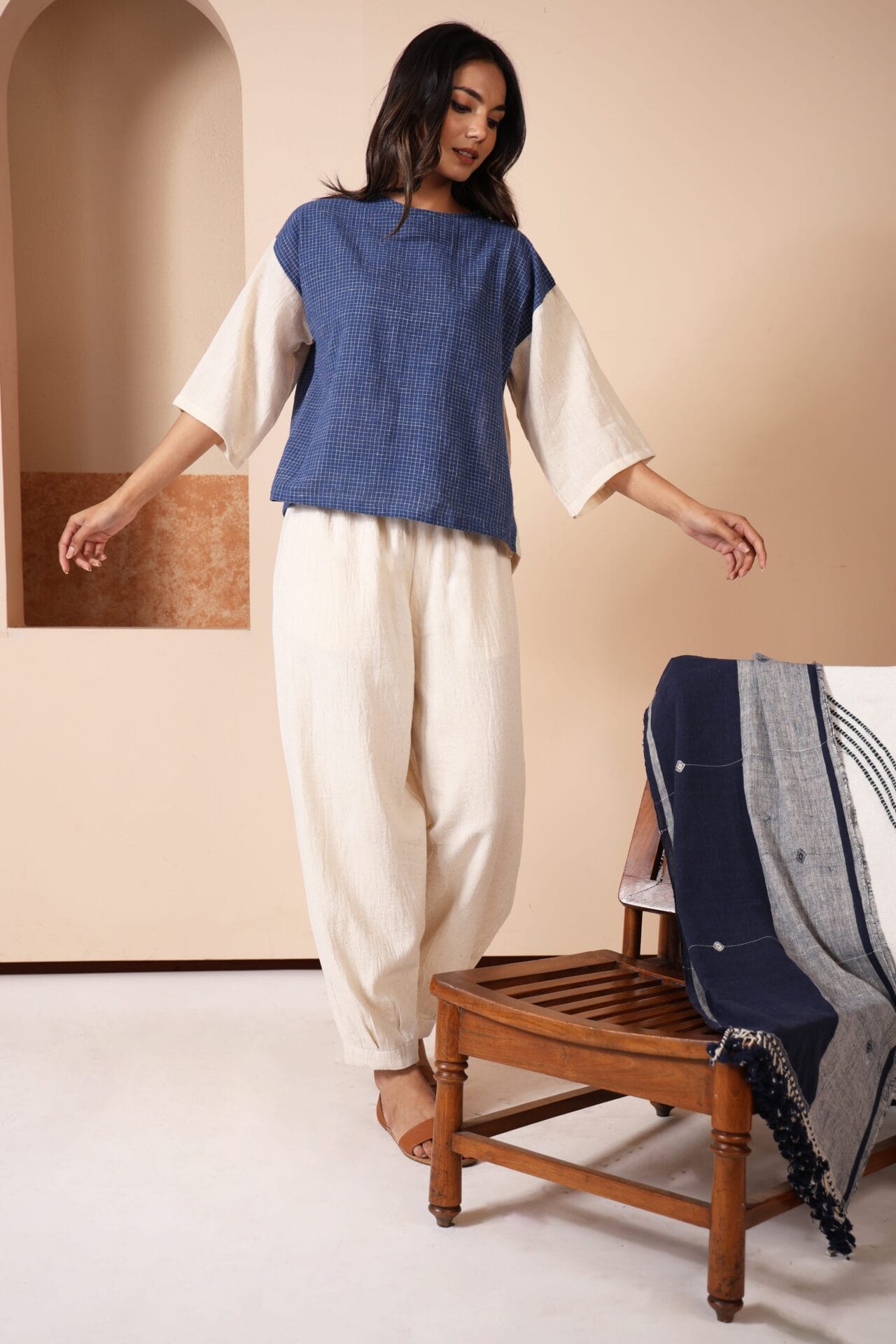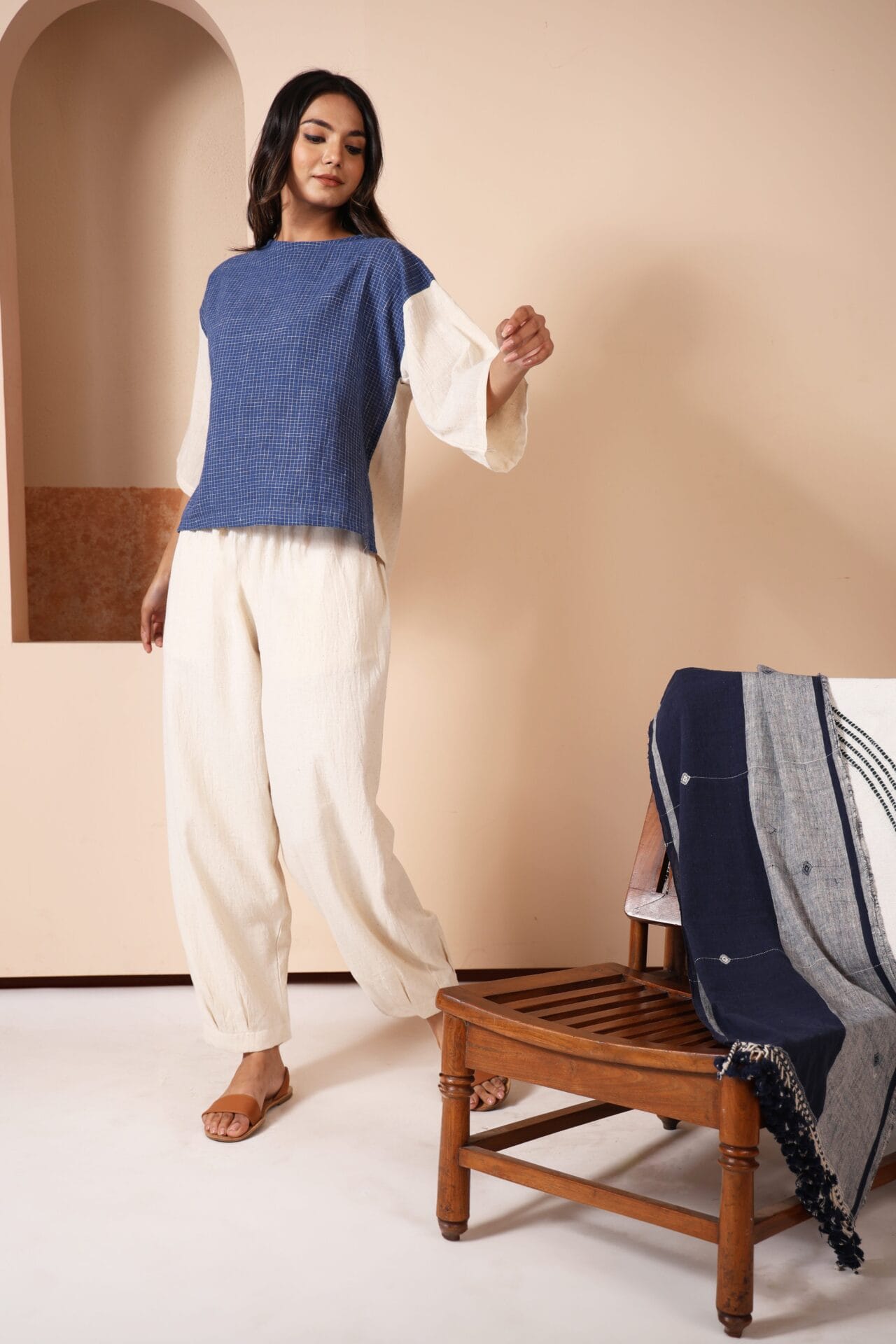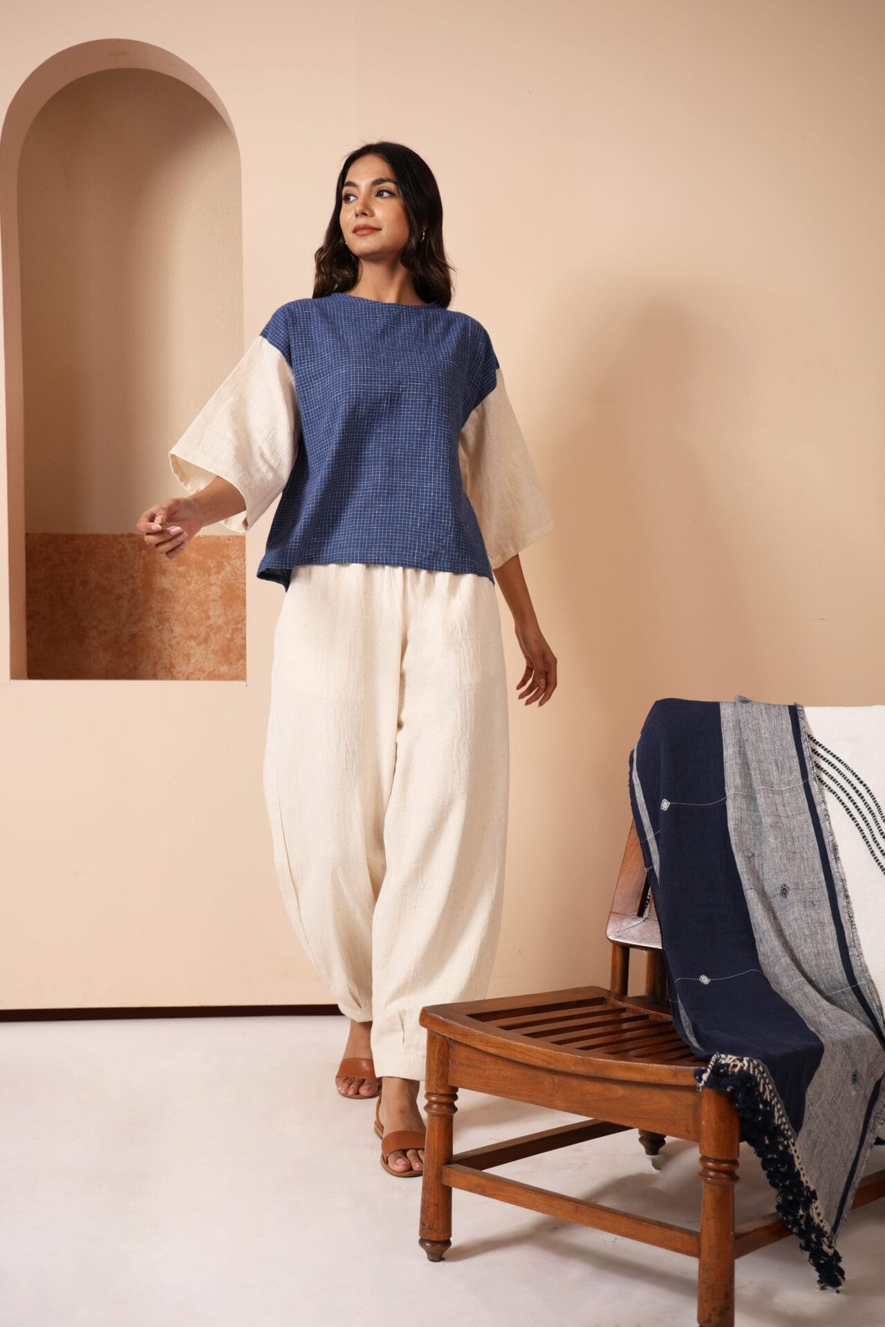Indulge in the timeless allure of Bermuda style off white handloom pants gracefully cinched with a vibrant offwhite belt in the front and elasticated at the back. WASH INSTRUCTIONS – ONLY DRYCLEAN. Transparency & Certificate: Made in India with care, using natural dyes and produced in small batches with ISO certification. Shipping Courier charges DOMESTIC(IN INDIA) : ?500/KG, INTERNATIONAL : ?3000/KG