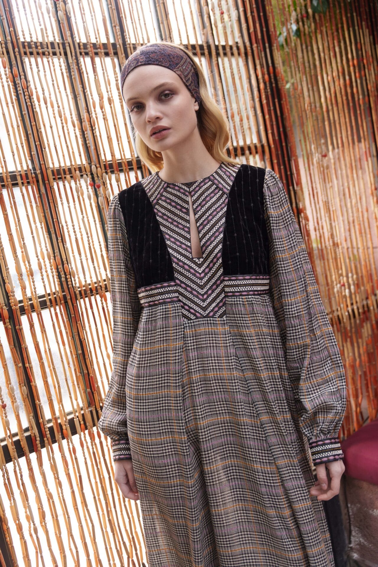 Black and white woven checks panelled maxi with faux leather and velvet embroidered yoke