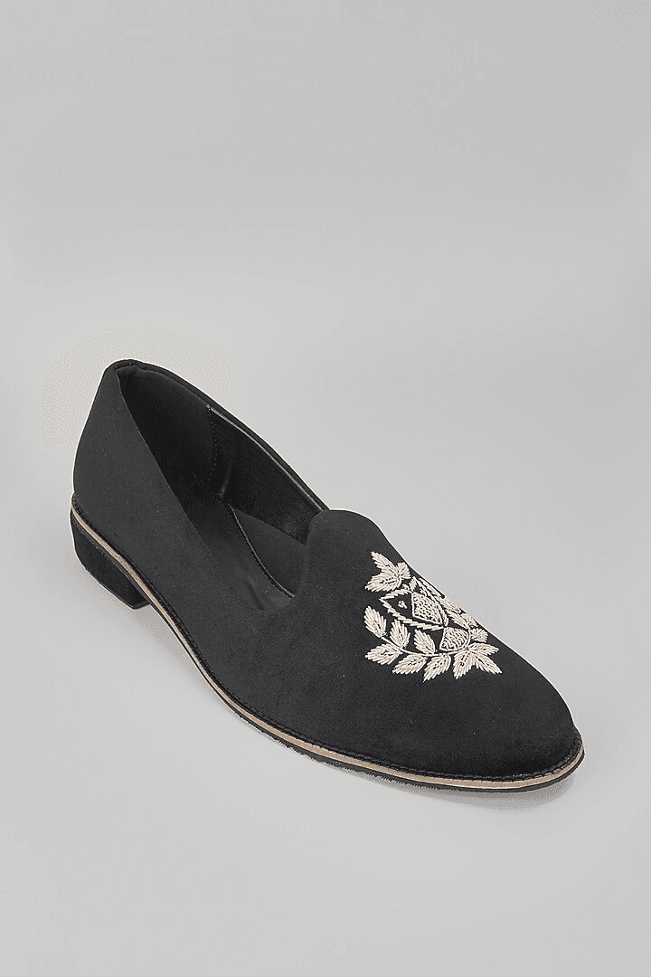 A pair of black suede based slip on loafers enhanced with hand embroidered royal crest. It has a padded leather lining and a hard sheeted rubber sole.