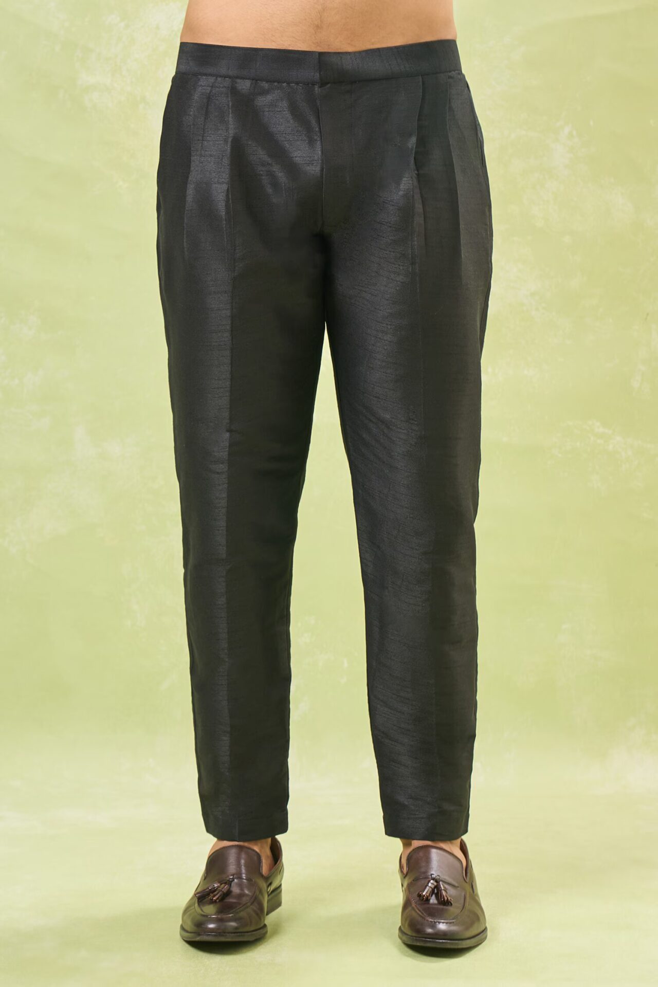 Black terry silk based achkan enhanced with wildlife resham embroidery, paired with a matching dupion silk based pants.