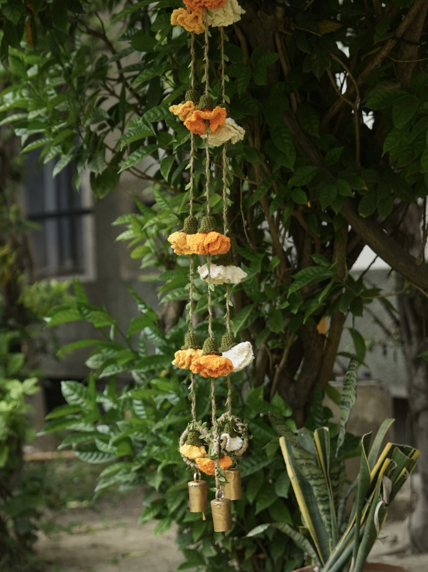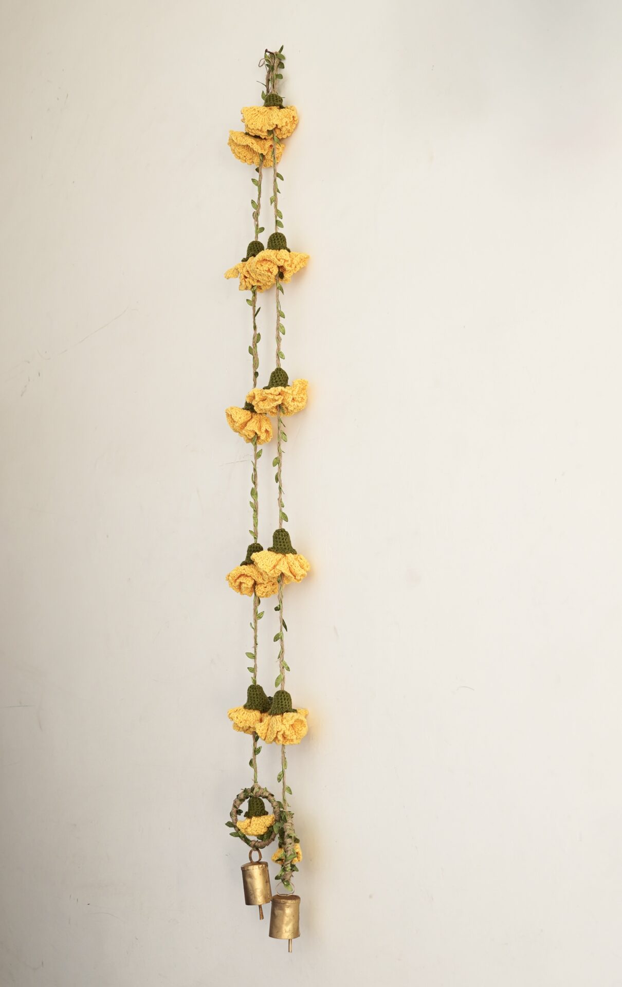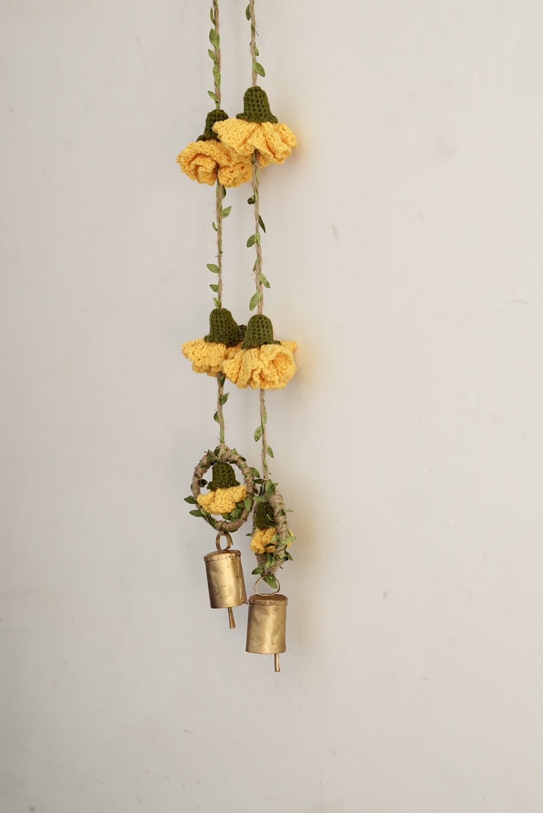 Celebrate the season of lights with handmade beauty that lasts beyond the festivities. This decor hanging brings together crochet marigold flowers on sturdy jute yarn, finished with a brass bell that adds a gentle, traditional chime. A loop at the top makes it easy to hang on doors, walls, or windows, filling your home with festive warmth and charm.