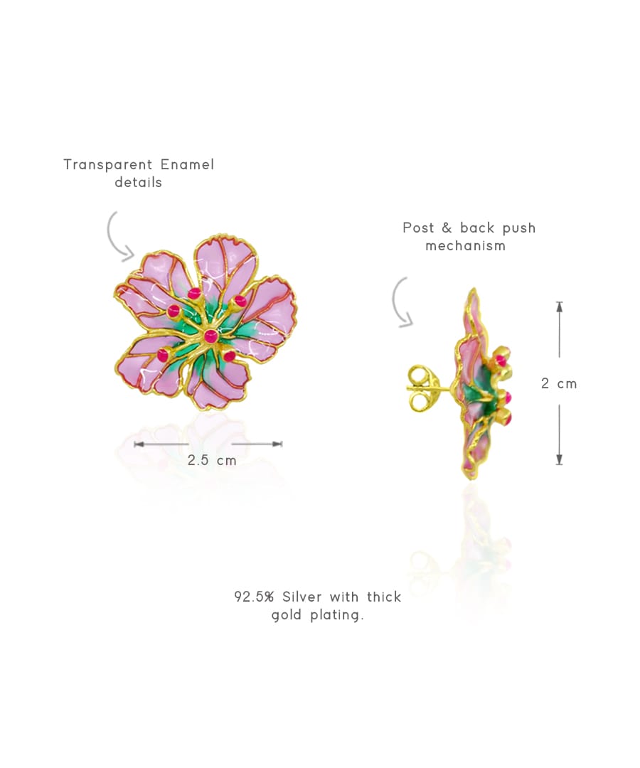 A delicate bloom brought to life in 925 sterling silver, these handcrafted stud earrings features luxurious gold plating and intricate transparent enamel work. The design captures the softness of petals in motion, paired with vibrant shades that add a fresh, feminine charm. Lightweight yet statement-worthy, it?s crafted to elevate festive looks and everyday elegance with effortless beauty. , Plating: Gold Plated, Metal Type: 92.5% Sterling Silver, Enamel / plating / gemstone: Transparent Enamel, Lock Mechanism: Post and push back, Measurement cm : 2 x 2.5 cm, Measurement inches: 0.78 x 0.98 inch, Care Instruction: Keep away from water, perfume and other liquids. Do not use any cleaning agents. Clean when storing in the provided pouches. Store them in moisture free areas and keep them away from water and liquid fragrances.