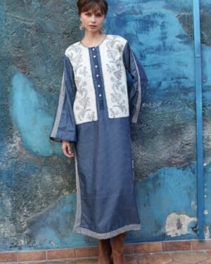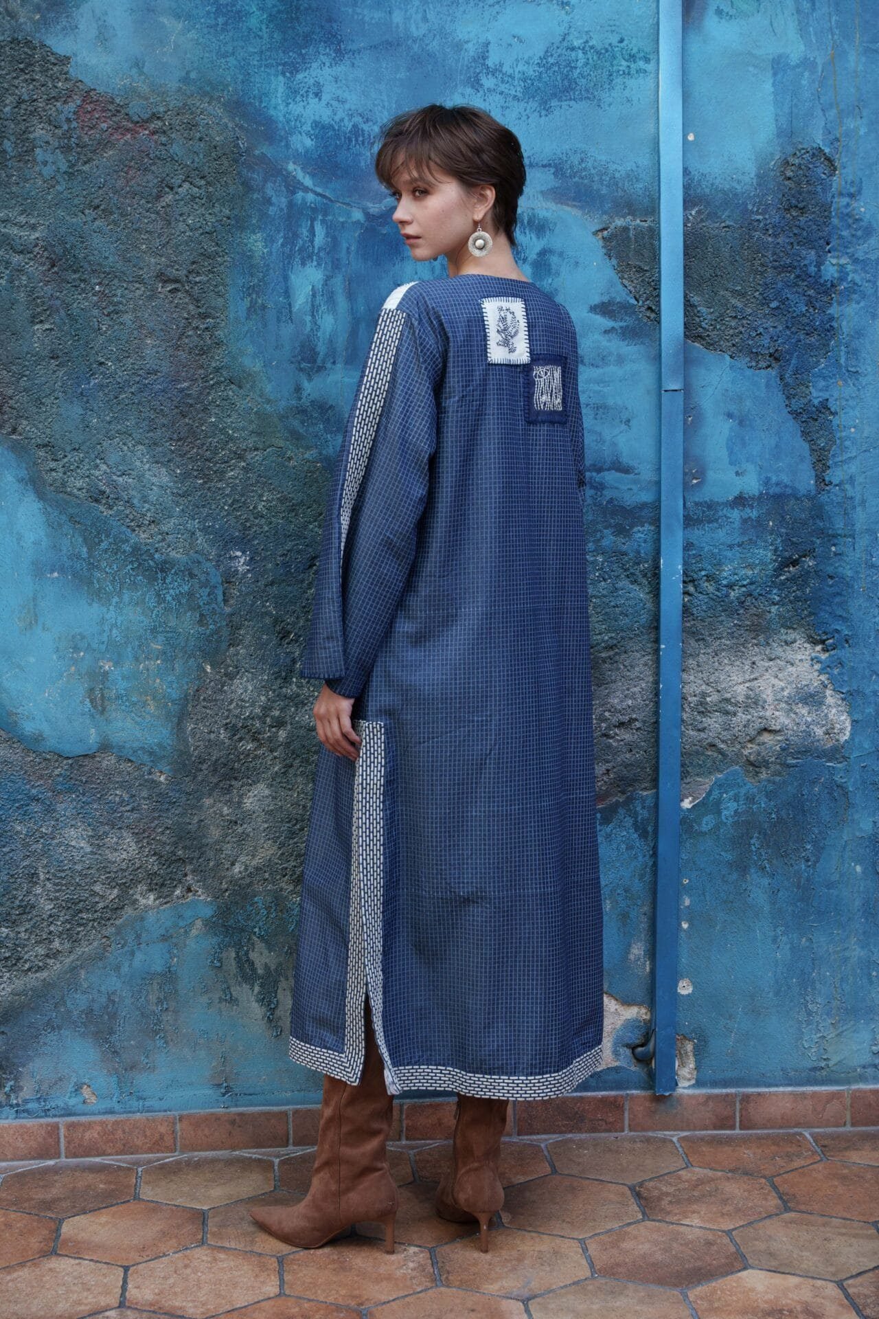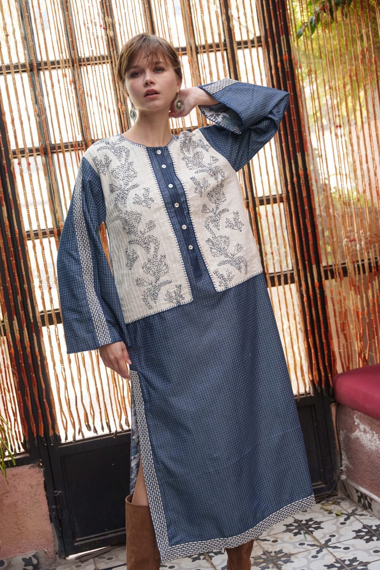 Blue denim kaftan tunic with couching embroidery and co-ord work applique on back