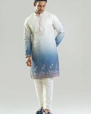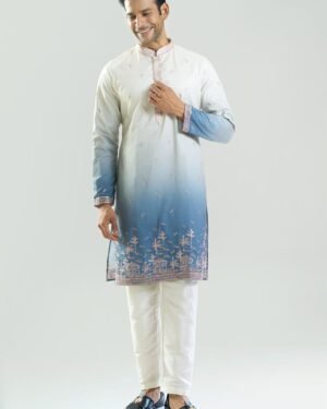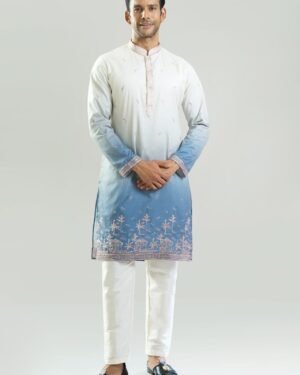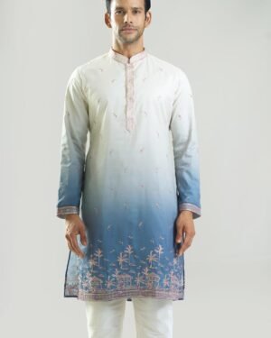 Blue silk based kurta enhanced with resham and sequins embroidery, paired with an off white dupion silk based pants.