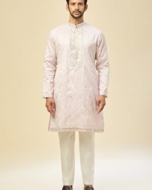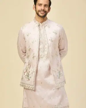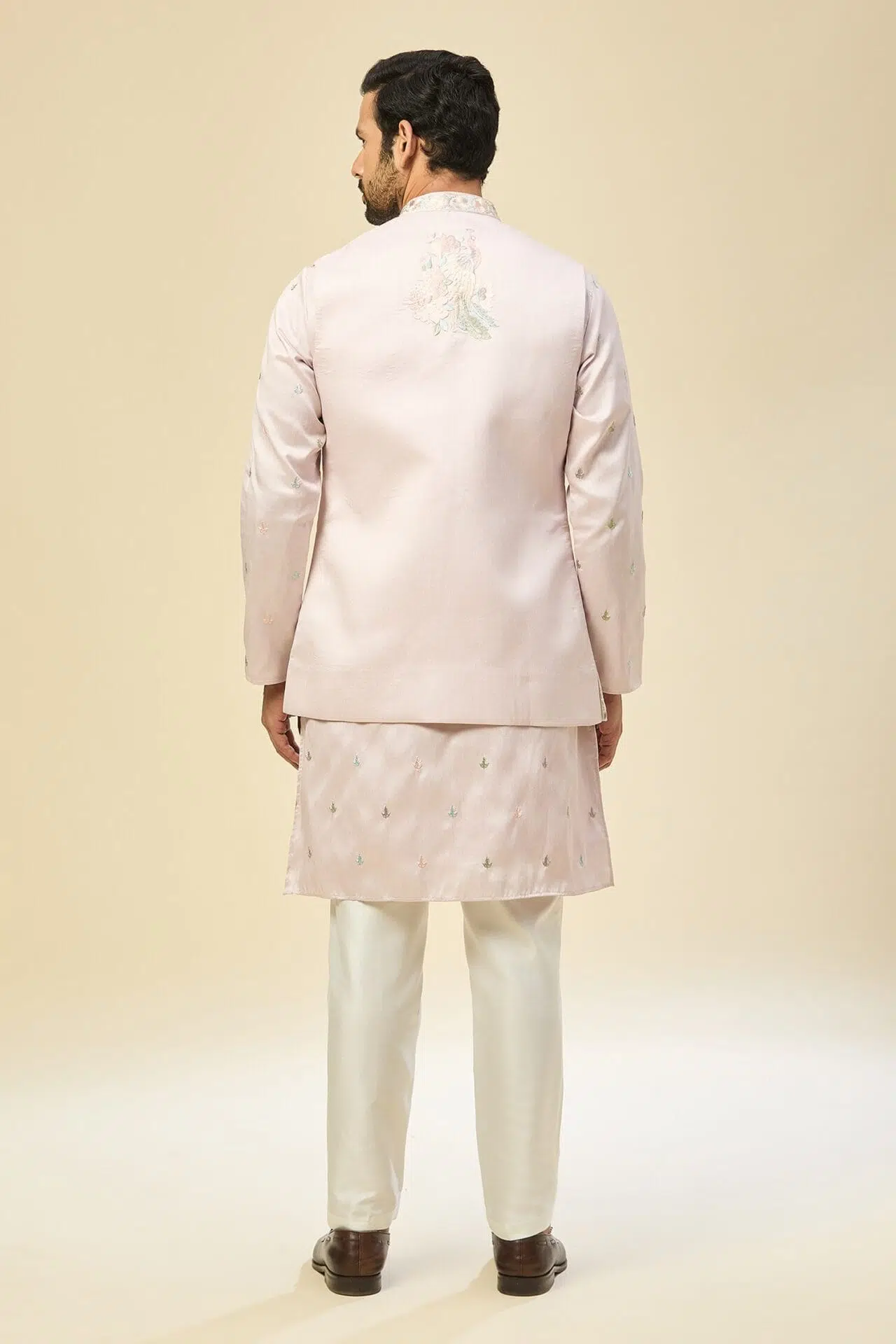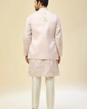 Blush Pink raw silk based jacket enhanced with resham embroidery, paired with a matching crepe silk based kurta enhanced with resham embroidery and an off white dupion silk based mexican pants.