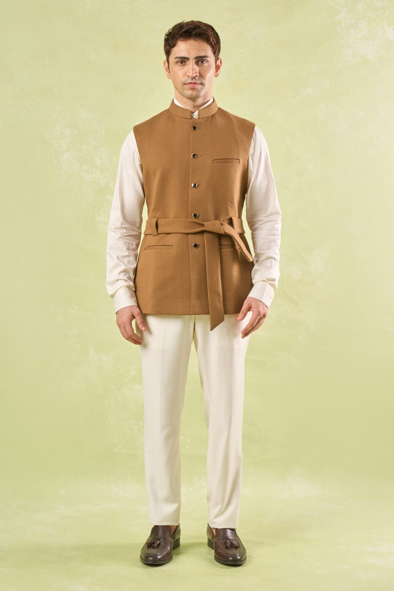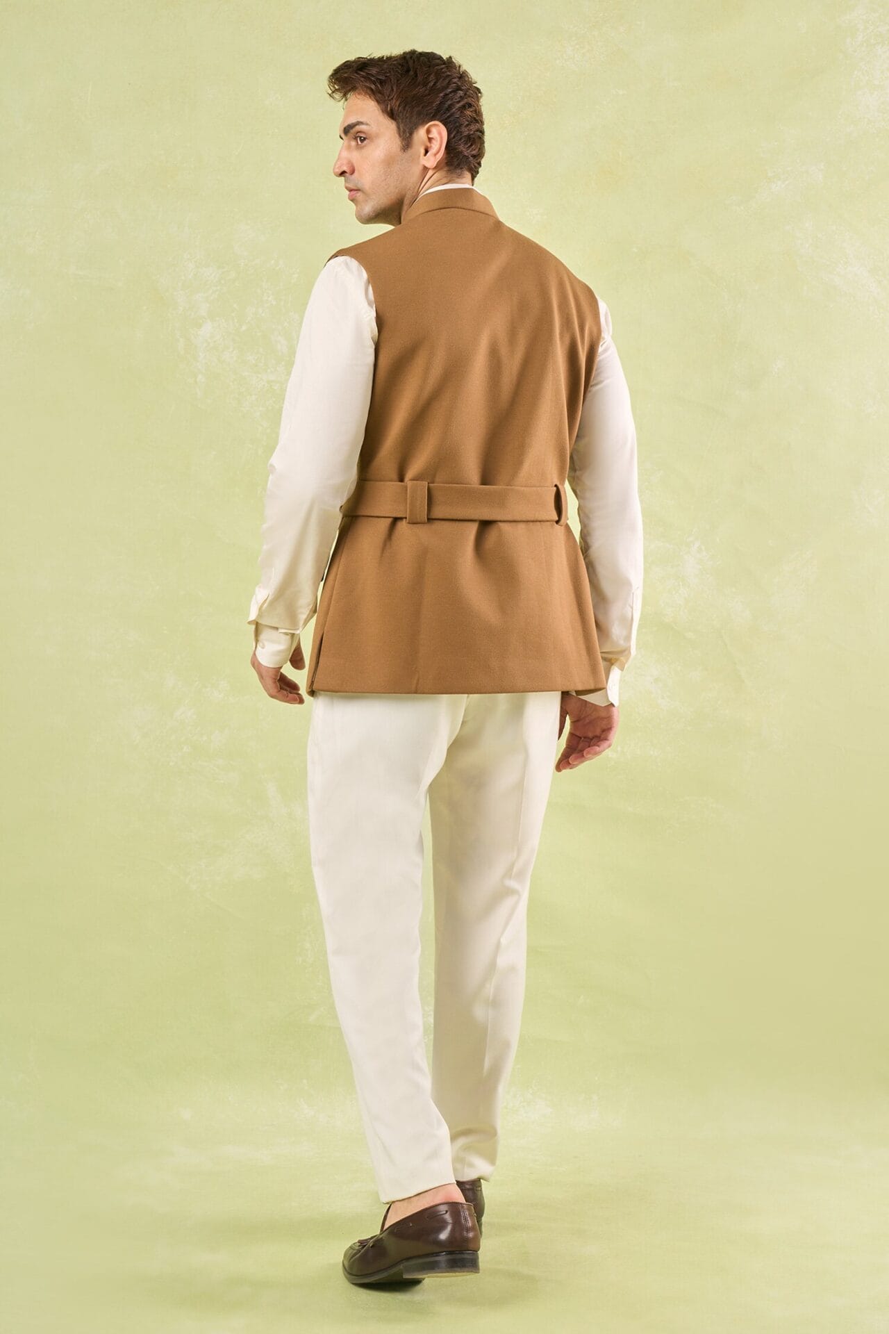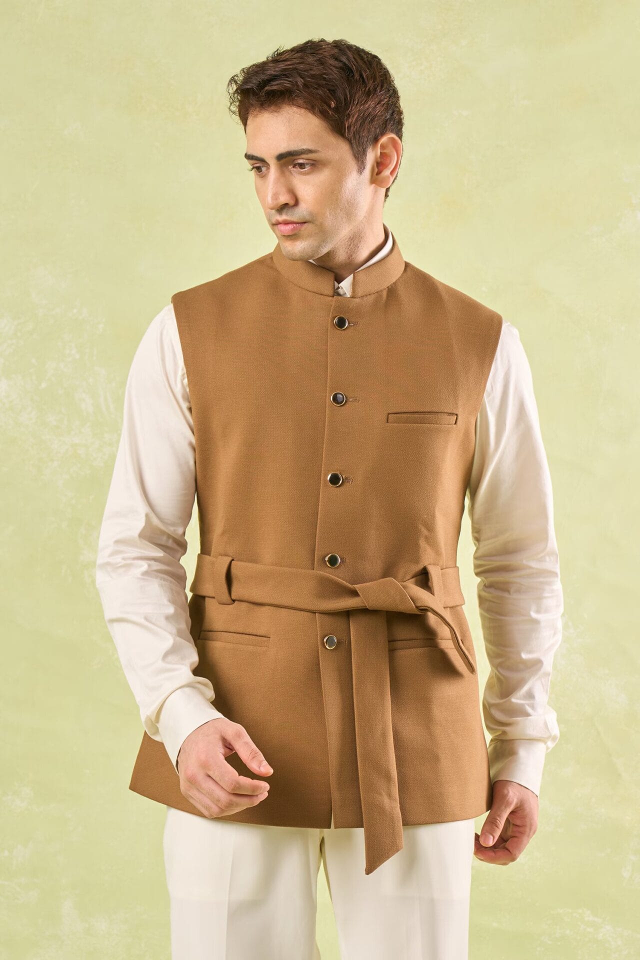 Brown french terry based jacket enhanced with a belt, two hand pockets and a pock square pocket detailing.