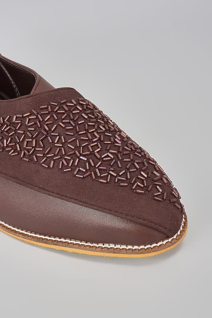 A pair of brown leather satin based slip on peshawaris enhanced with all over cutbead work. It has a padded leather lining and a hard sheeted rubber sole.