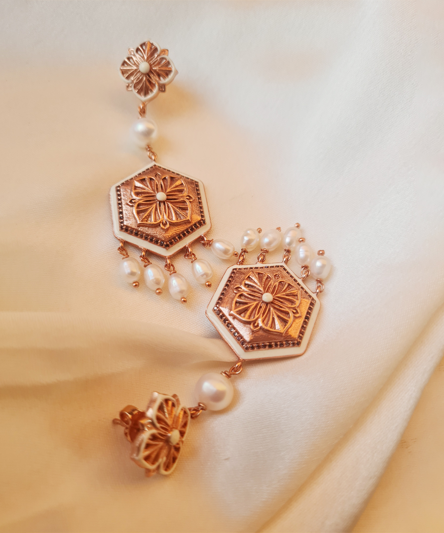 These long earrings are beautifully crafted from 92.5% sterling silver, featuring intricate enameling details and a rose gold plating. Adorned with sparkling zircons along the border and hanging beads, they also feature a pearl at the center, adding length and elegance to the design. The combination of these elements creates a chic, festive touch., Plating: Rosegold Plated, Metal Type: 92.5% Sterling Silver, Enamel / plating / gemstone: Gemstone : Brown zircons, Lock Mechanism: Post and push back, Measurement cm : 6 cm , Measurement inches: 2.36 inch, Care Instruction: Keep away from water, perfume and other liquids. Do not use any cleaning agents. Clean when storing in the provided pouches. Store them in moisture free areas and keep them away from water and liquid fragrances.