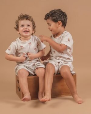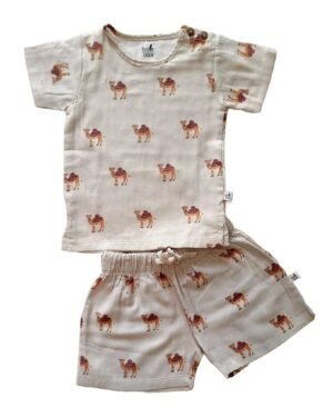 100% organic muslin cottonMatching set of tshirt and shortLightweight and extremely soft, perfect for summerCute Neutral PrintsPoppers at the side help with easy pull up over the head.Drawstring pants for comfort wear