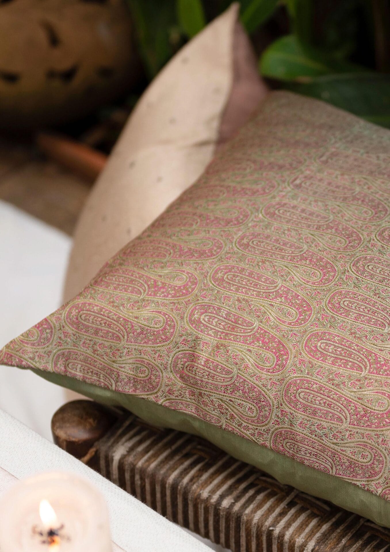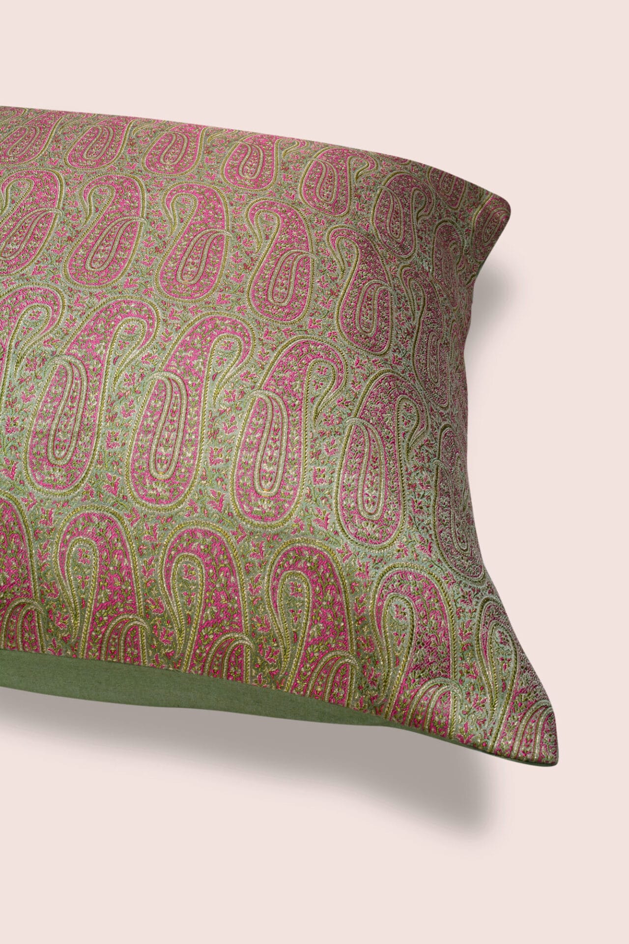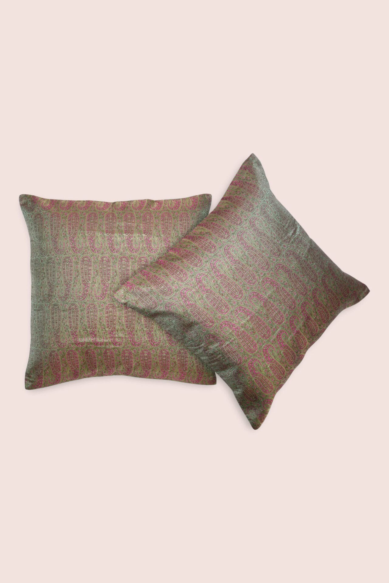 Let the corners of your home spark the spirit of the festive season with our jacquard Hazrat Handwoven Cushions. Inspired by the Mughal Era patterns, the cushions are styled with allover jacquard weave that elevates the feel of the green and pink shaded silk.