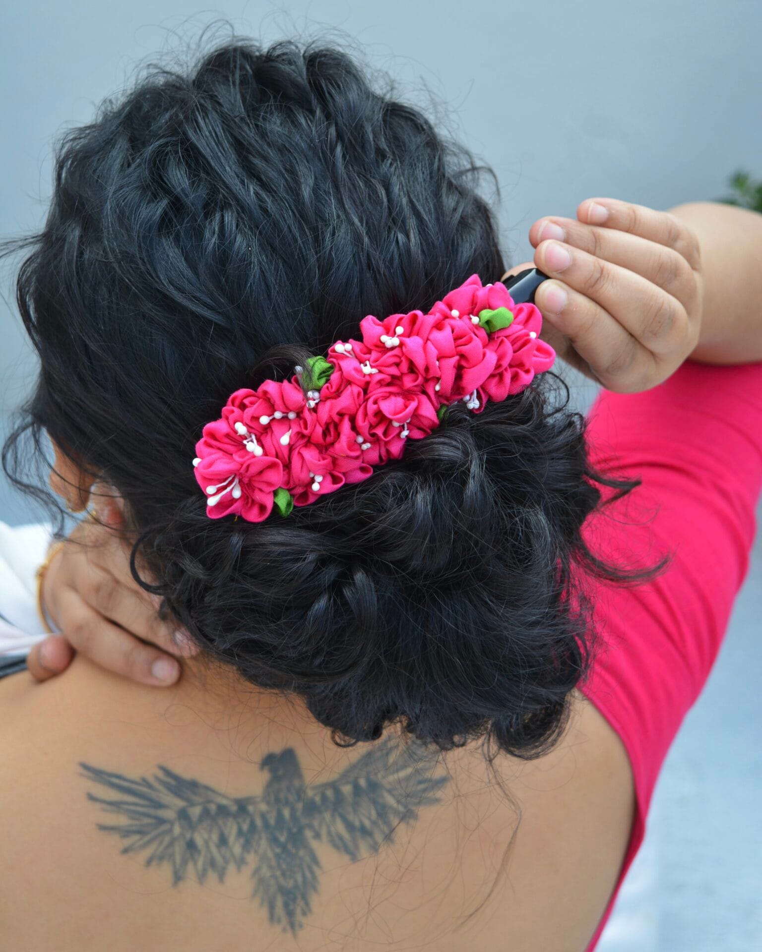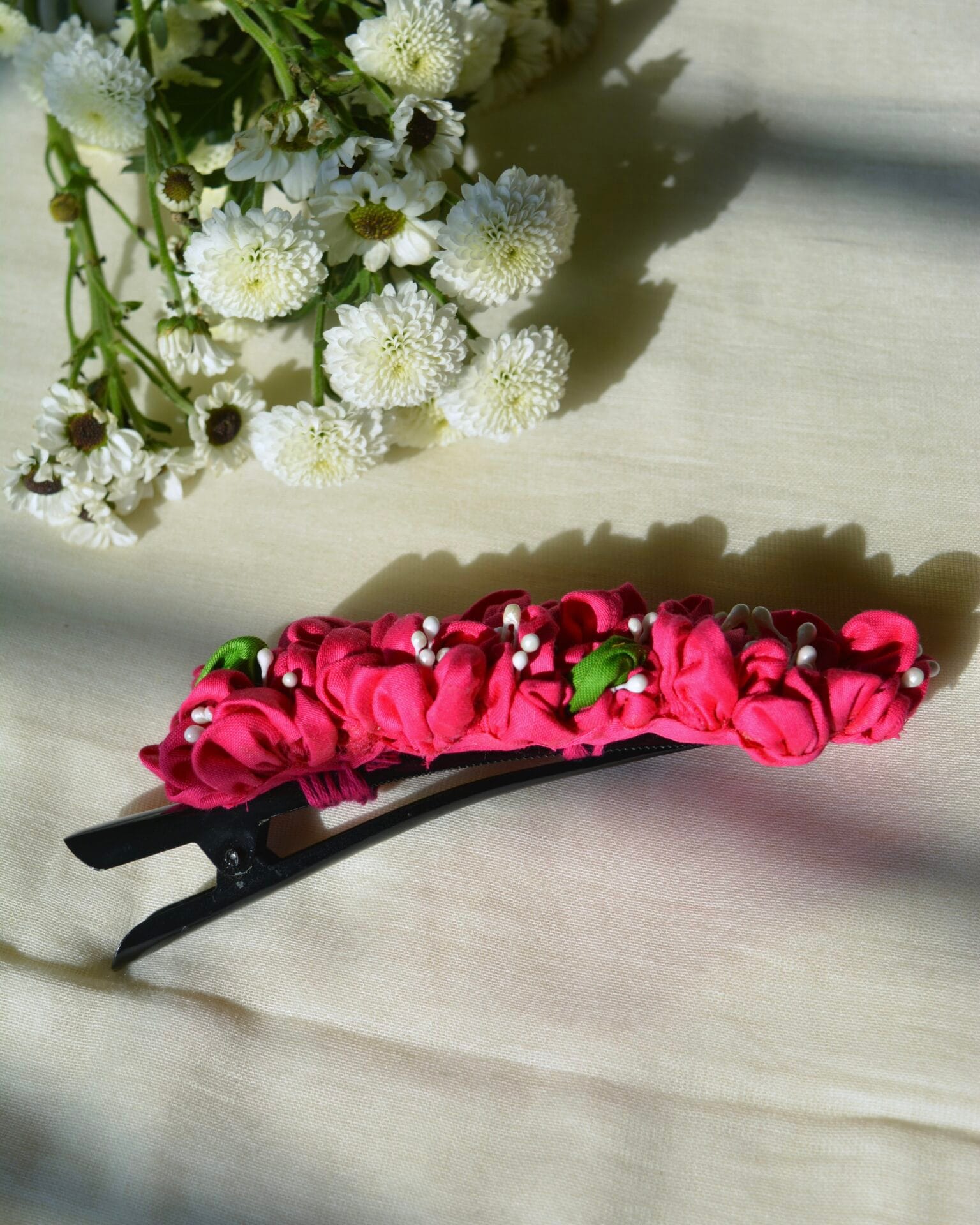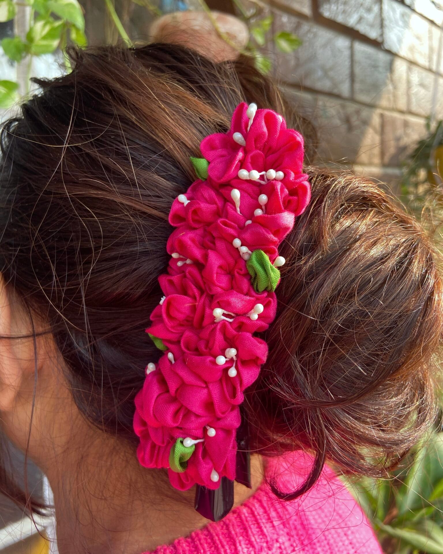 Introducing Chandni Claw Clip, a mesmerizing accessory that seamlessly merges elegance with a vibrant flair. Crafted from an exquisite array of three dozen hand-stitched fabric flowers in a striking hot pink hue, this claw clip serves as a definitive statement piece for any hairdo.