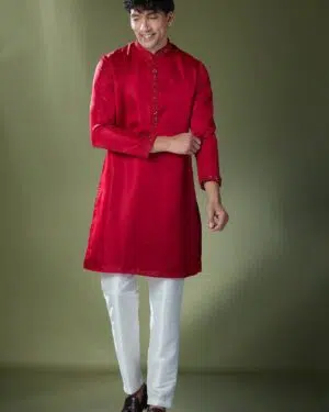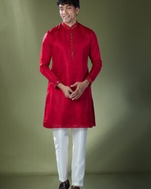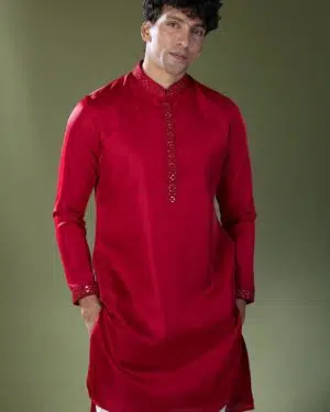 Cherry Red slub silk based kurta enhanced with mirror embroidery paired with an off white dupion silk based pants.