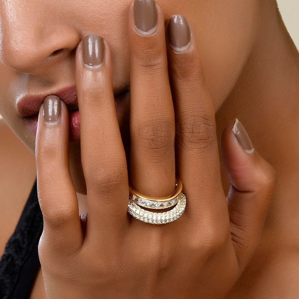 Introducing the Classic Facet Ring, a dazzling statement piece featuring princess-cut cubic zirconia stones wrapped arou