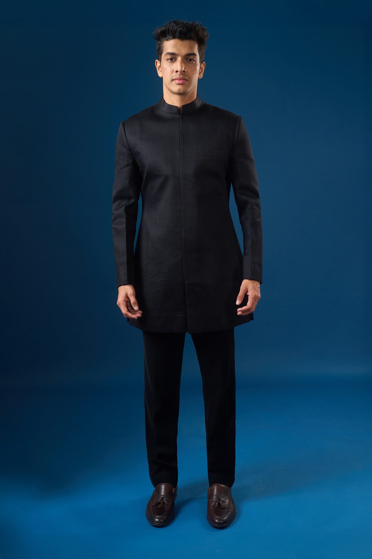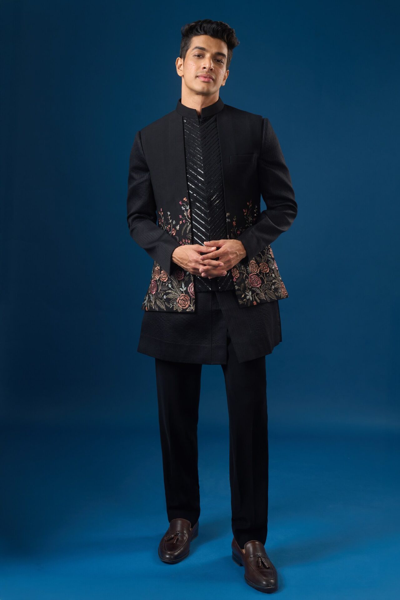 Black french terry based bundi enhanced with fauna resham embroidery and cut dana placket, paired with a matching cotton silk kurta enhanced with all over running stitch paired with a matching frech terry pants.