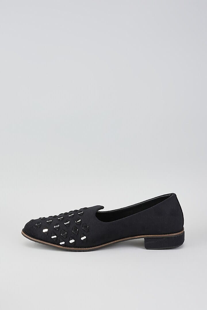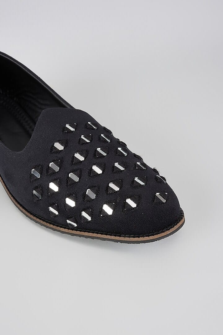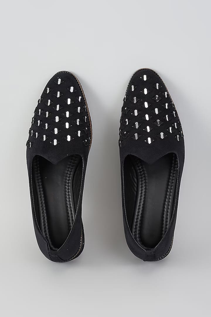 A pair of black suede velvet based slip on loafers enhanced with geometric mirror embroidery. It has a padded leather lining and a hard sheeted rubber sole.