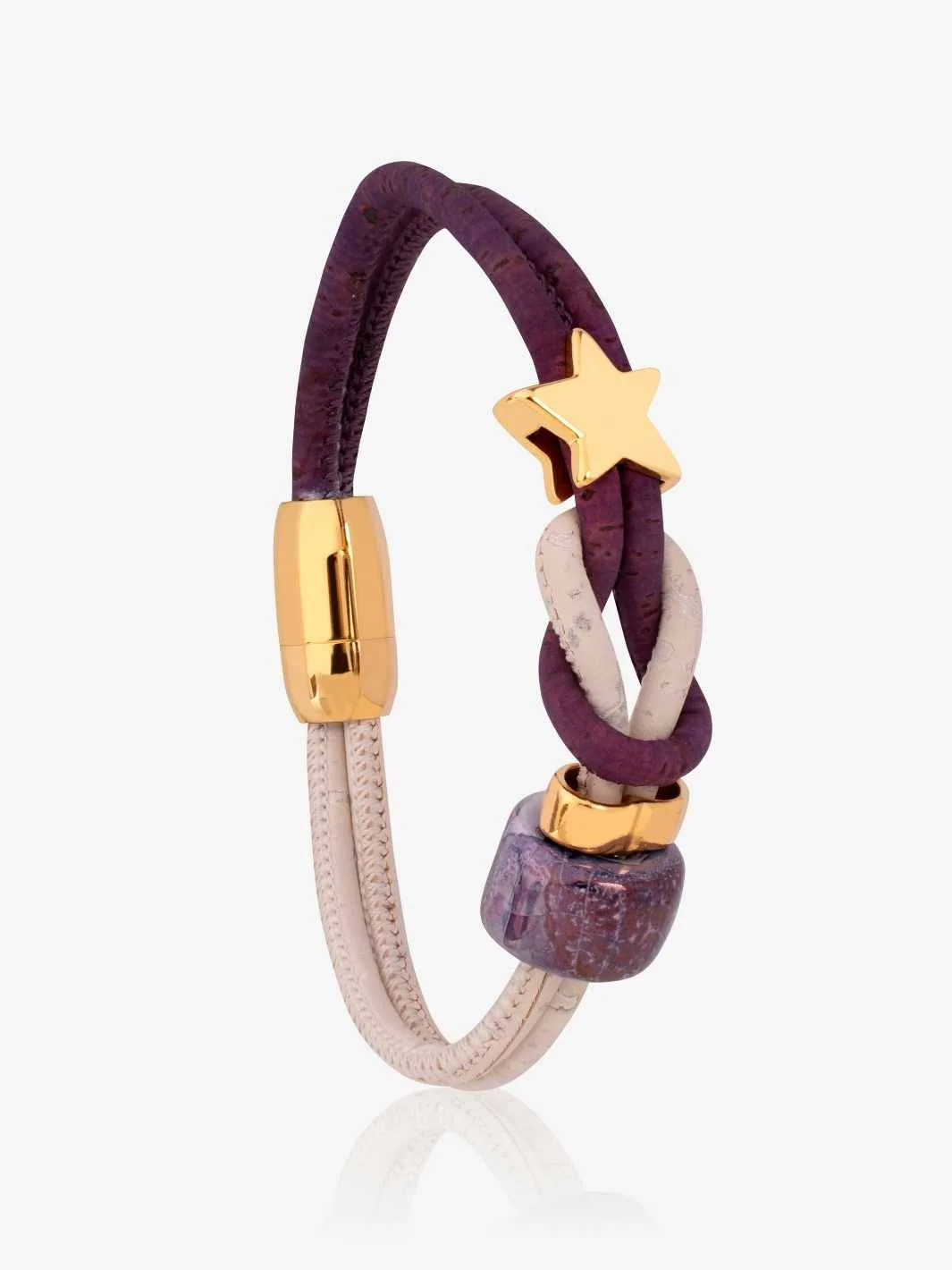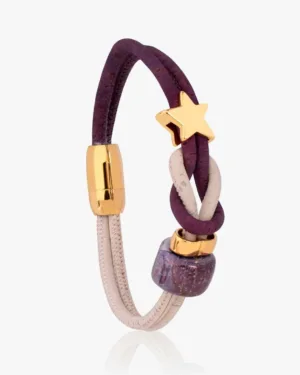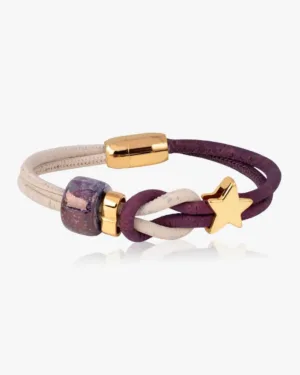 Our Sustainable and Vegan jewellery is inspired by nature's stunning riot of colours. Handmade from genuine Cork in purple and white with a glossy blue ceramic bead and a bright star in gold, our bracelet is elegant and refined. Made for a modern lifestyle, it is a classic with a touch of celebration.