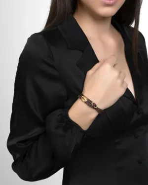 Cowrie shell in gold and cork is a timeless addition to every attire. It's a spectacular statement of nature and style coming together, making it the ideal accessory for work or an evening outing.