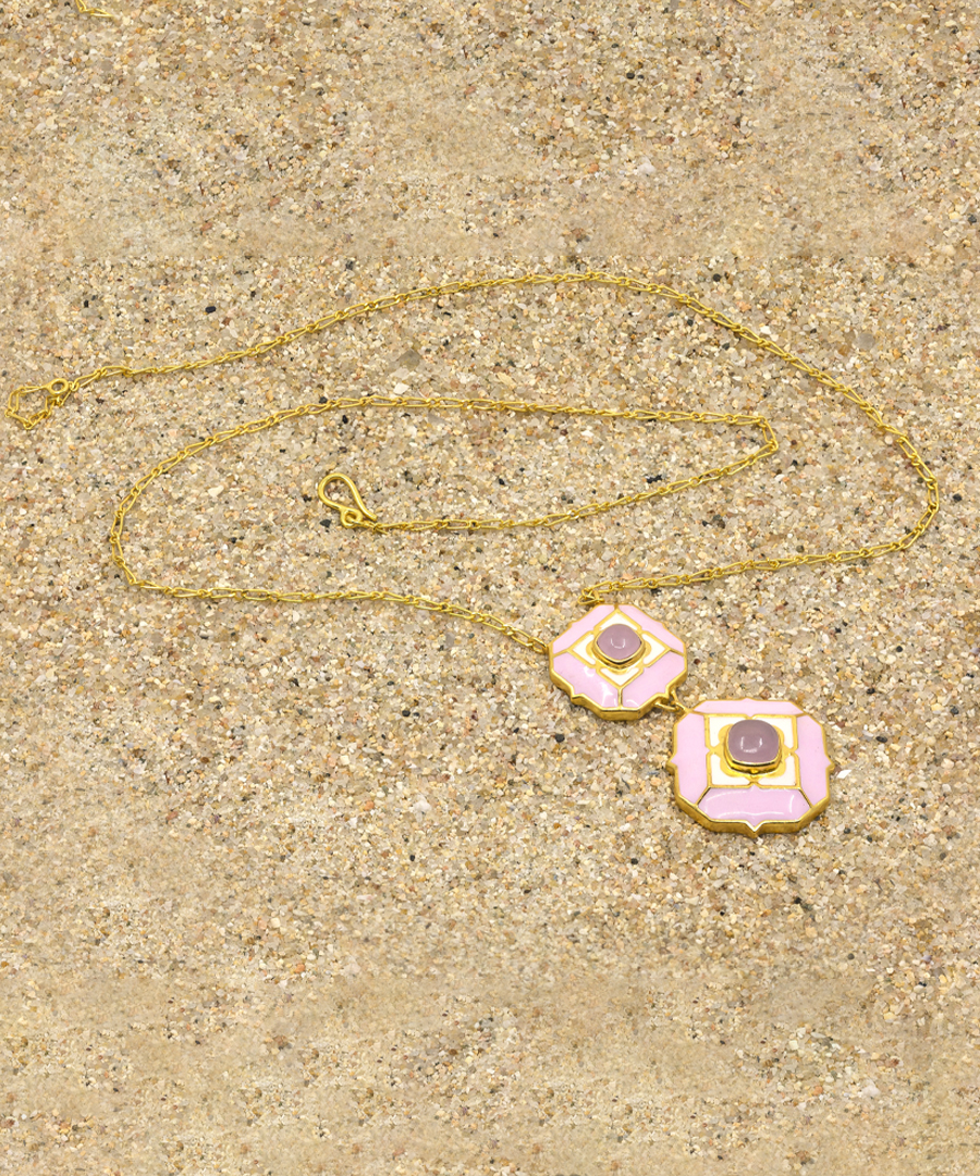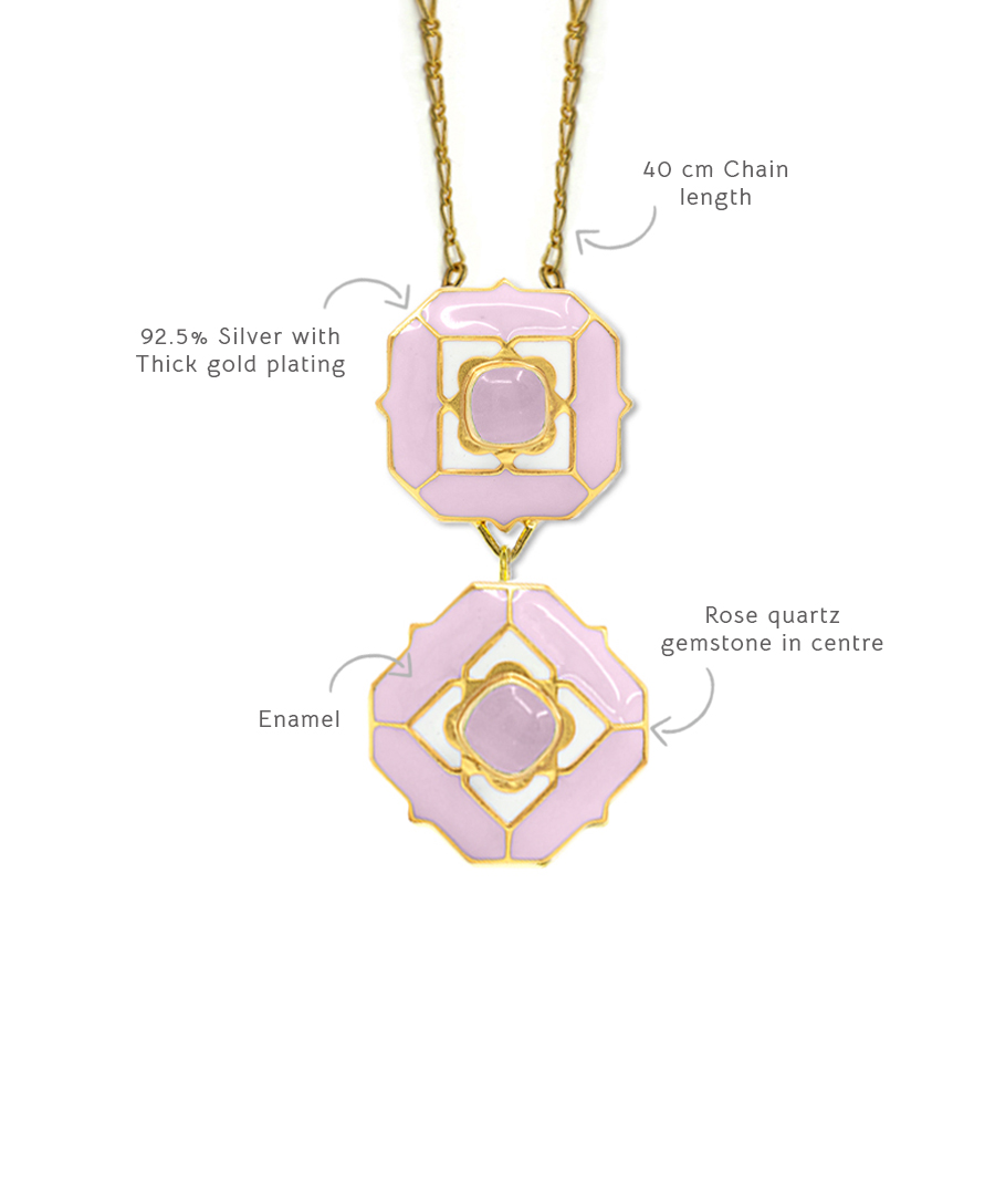 The pendant is handcrafted in 92.5% silver with thick gold plating & enamel details.measures 1.5 inch, attached to 20 inch chain it has ring clasp lock for easy wear., Plating: Gold Plated, Metal Type: 92.5% Sterling Silver, Enamel / plating / gemstone: Natural gemstone Rose Quartz, Lock Mechanism: Ring clasp lock, Measurement cm : 3.81 cm