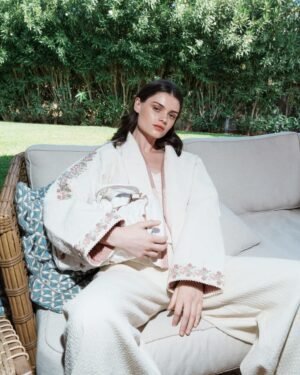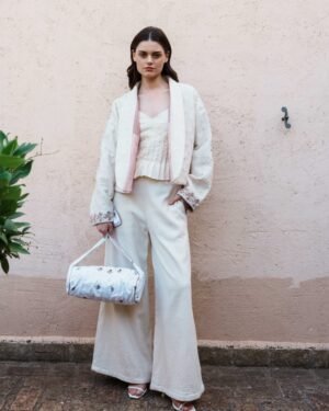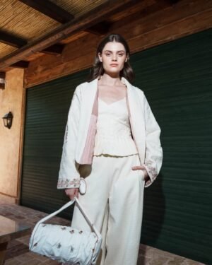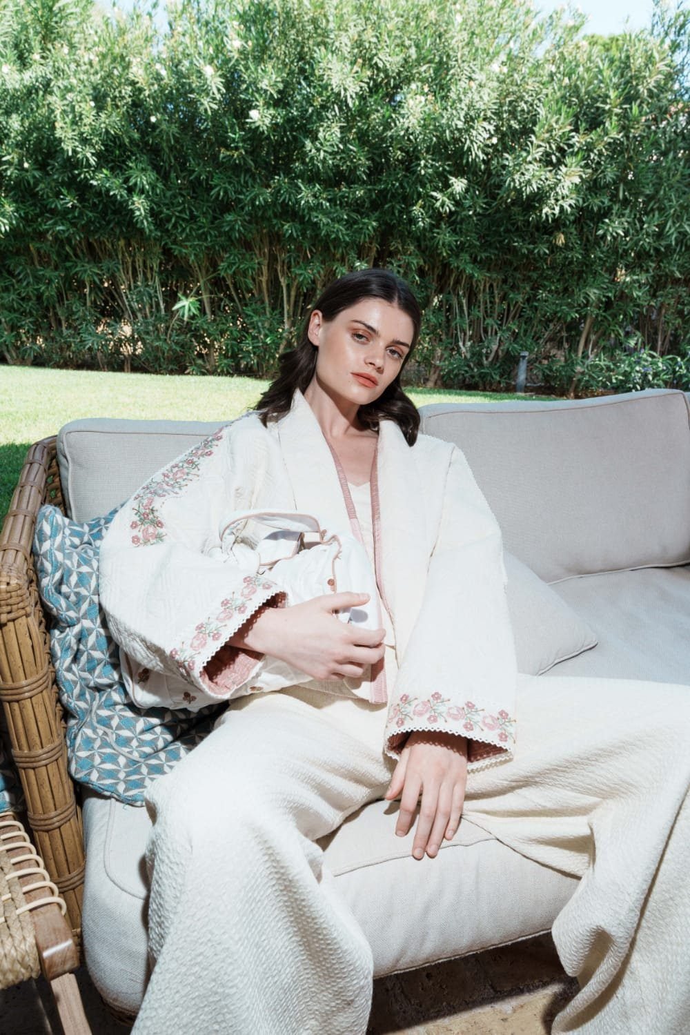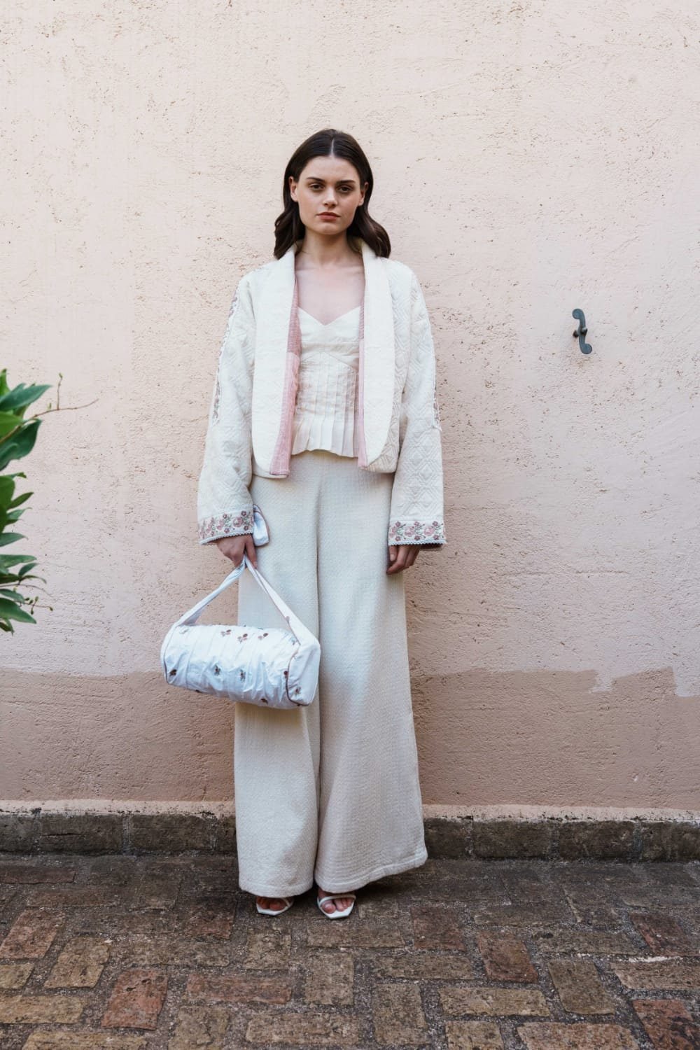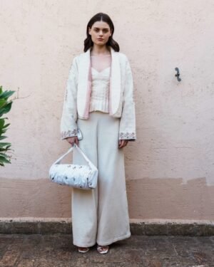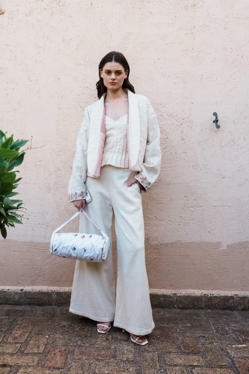 This Ecru cotton rose lace quilted tree of life jacket with embroidered borders is a statement piece with intricate embroidery and quilting ? a blend of structure, heritage, and contemporary sophistication.