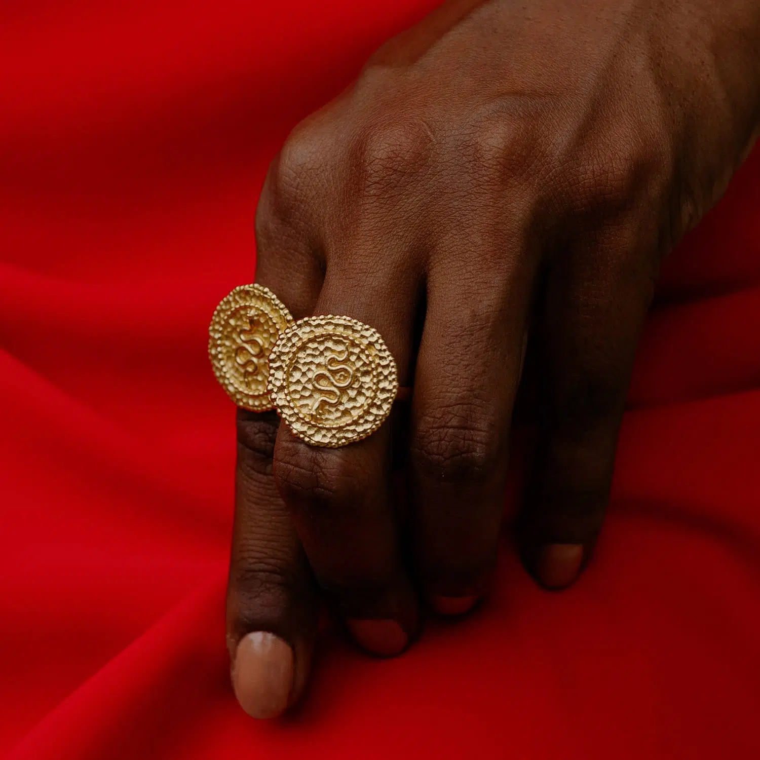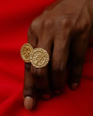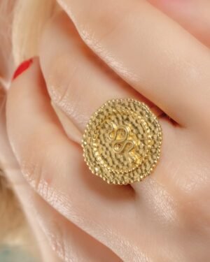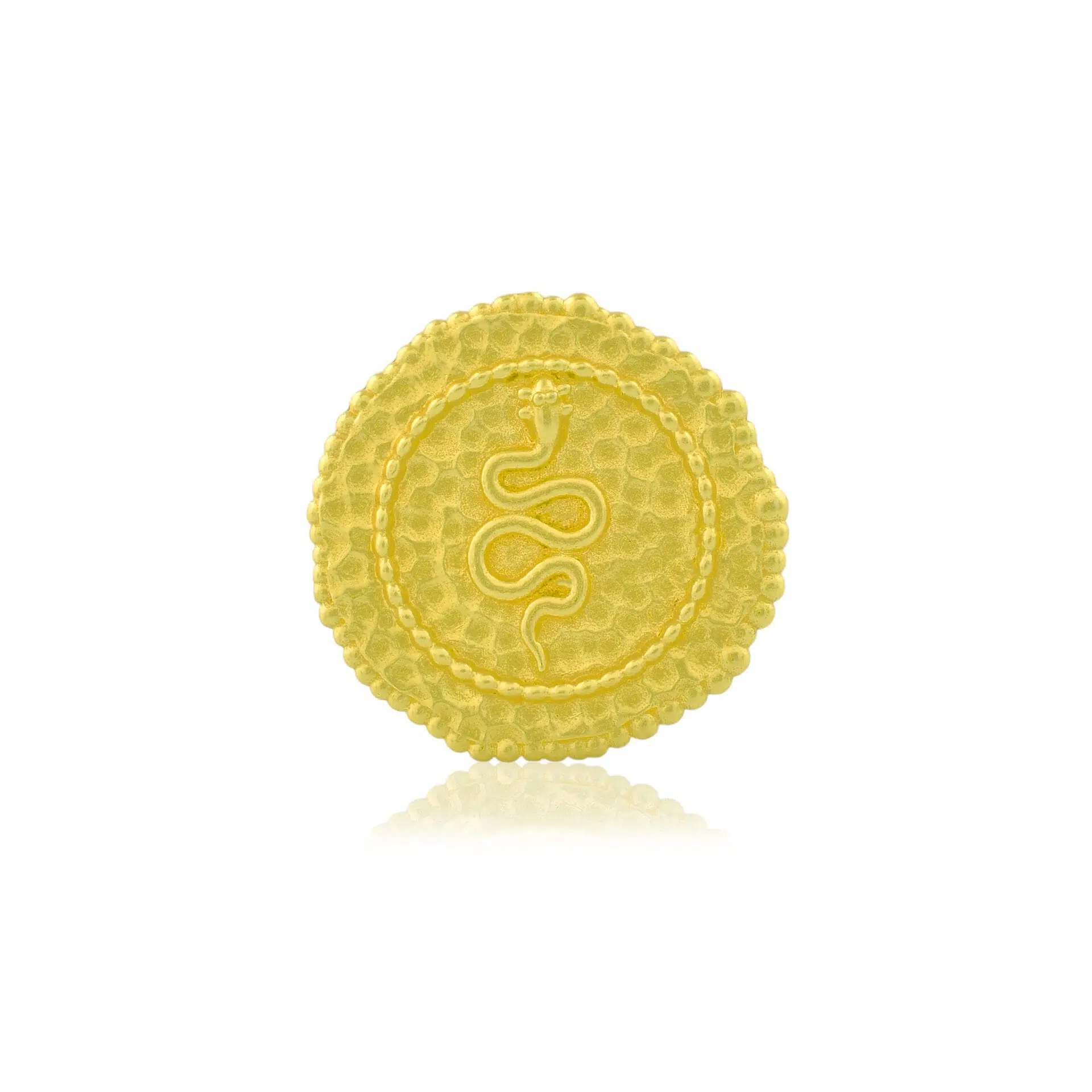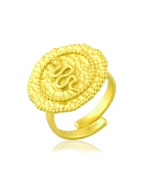 A unique Embossed Snake Coin Ring featuring a detailed snake design with a gold-textured coin shape. Crafted with 22KT r