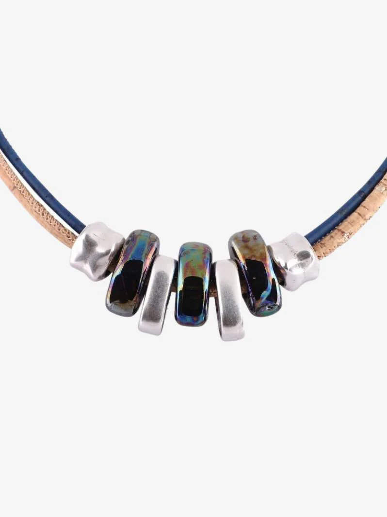 FOReT Estella Cork necklace stands out with the unique combination of gasoline colour ceramic beads and silver charms.