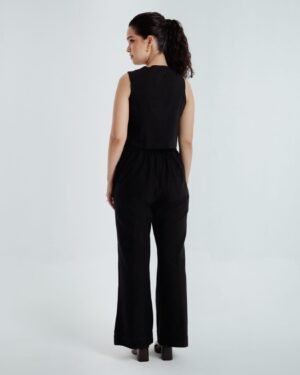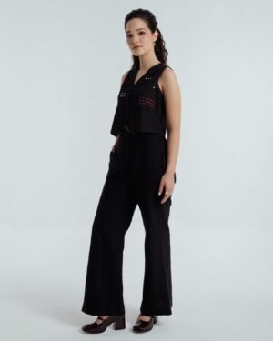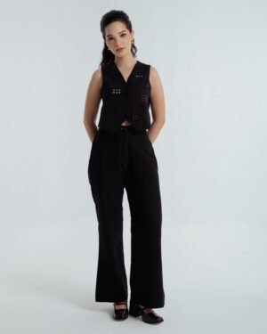 This bohemian black waistcoat, crafted from fine handwoven organic cotton spun in Bengal, features delicate embroidery in contrasting red and beige hues, adding warmth and character. Fully lined for a crisp, structured fit, it is as versatile as it is elegant — pairing beautifully with both skirts and trousers, and effortlessly elevating any look.The coordinating black pants are a timeless classic, featuring a front zipper, practical side pockets, and a clean, tailored finish. Made from the same handspun organic cotton, they transition seamlessly from day to night and are especially striking when styled with the waistcoat.Effortless, refined, and rooted in tradition — Fayra is a celebration of heritage craftsmanship and understated sophistication.Waistcoat length: 17 inchesPants length: 40 inchesModel height: 5’7” (wearing size S)
