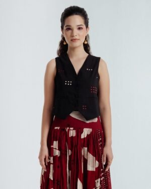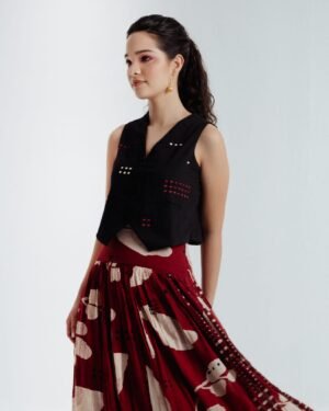 This bohemian black waistcoat showcases delicate embroidery in contrasting red and beige hues that beautifully can complement skirt or pant .Crafted from fine handwoven organic cotton spun in Bengal, it features a lined interior for a crisp, structured fit.Versatile and elegant, this waistcoat pairs effortlessly and can be styled with various pieces from your wardrobe.Waistcoat length 17 inchesModel height is 5"7 wearing S